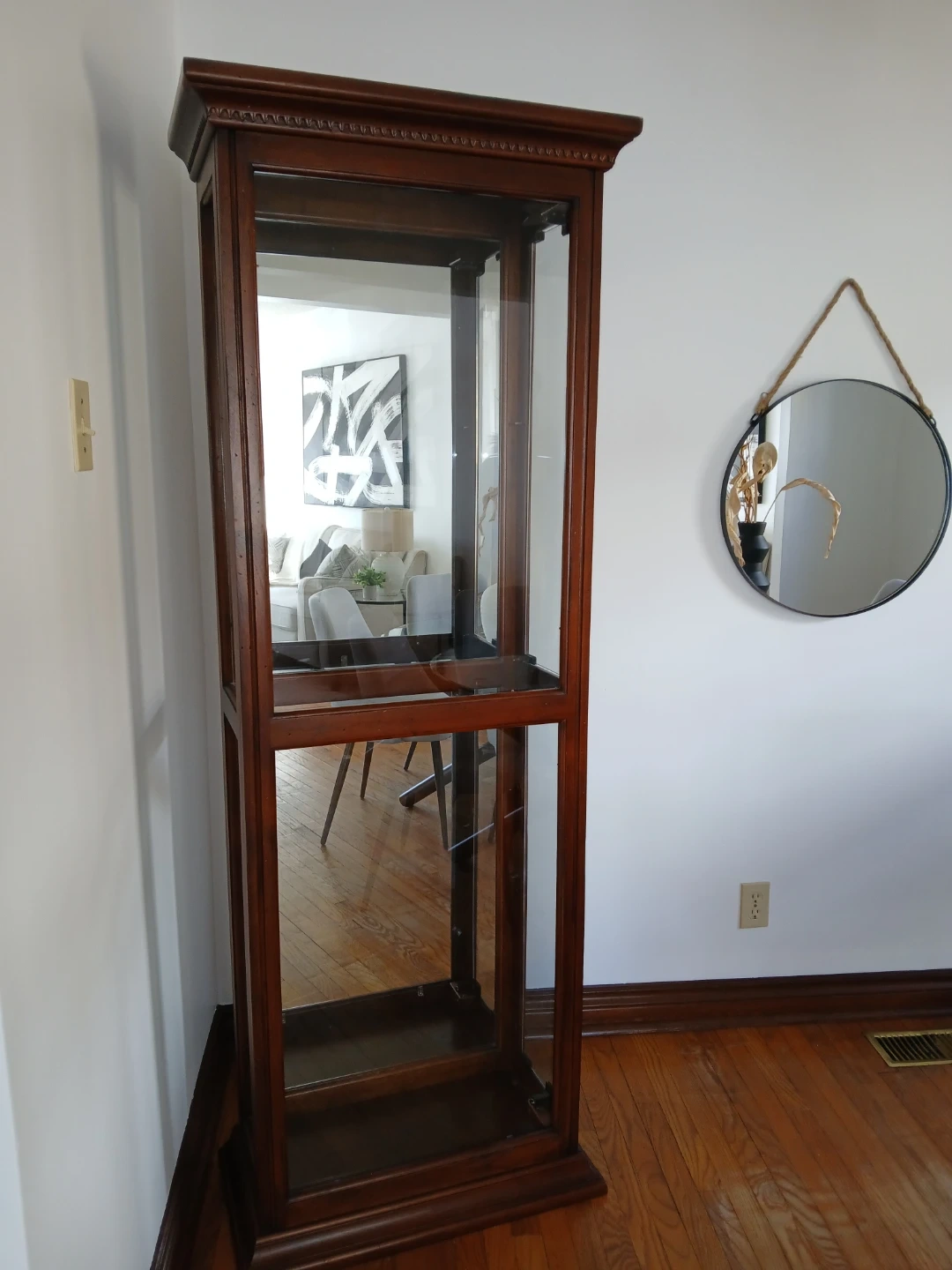 Wooden curio display cabinet. Beautiful and good quality. 1ft deep x 23 in x 6ft tall. 3 glass shelves that can be added. Opens typically on the side, but you can easily remove the front glass if you wanted to add larger items!