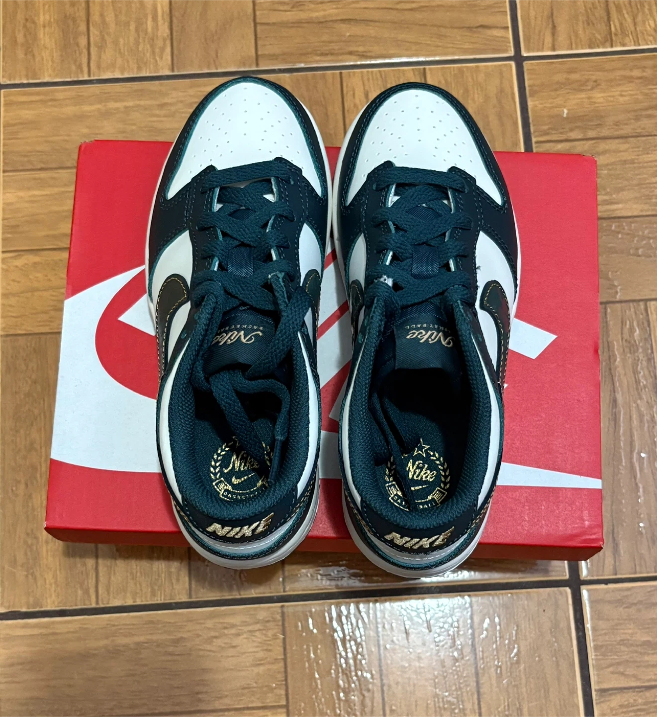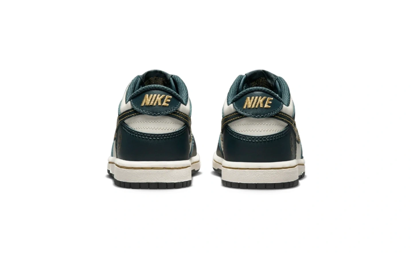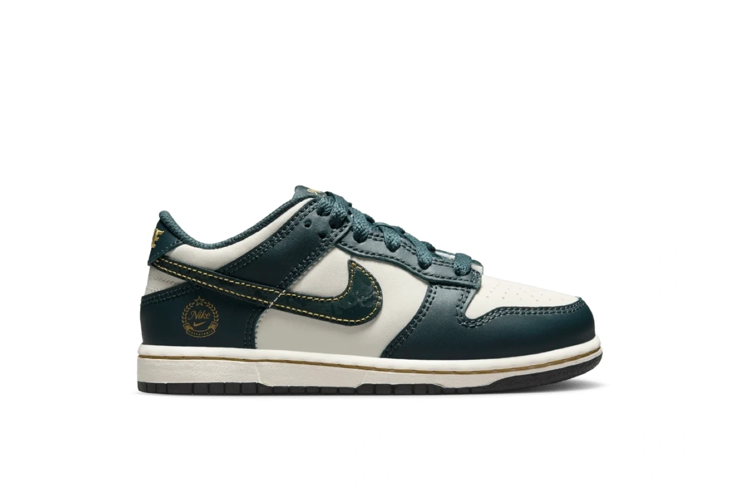 These are Little Kids' Nike Dunk Low sneakers in a "Deep Jungle" colourway. They feature a dark green and white leather upper with gold accents.