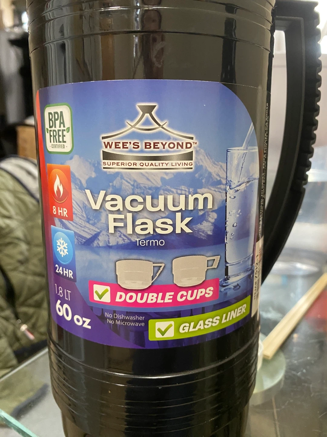 This Wee's Beyond vacuum flask keeps drinks hot for 8 hours or cold for 24 hours. It's a 1.8 liter or 60 oz capacity with a glass liner. Includes double cups.