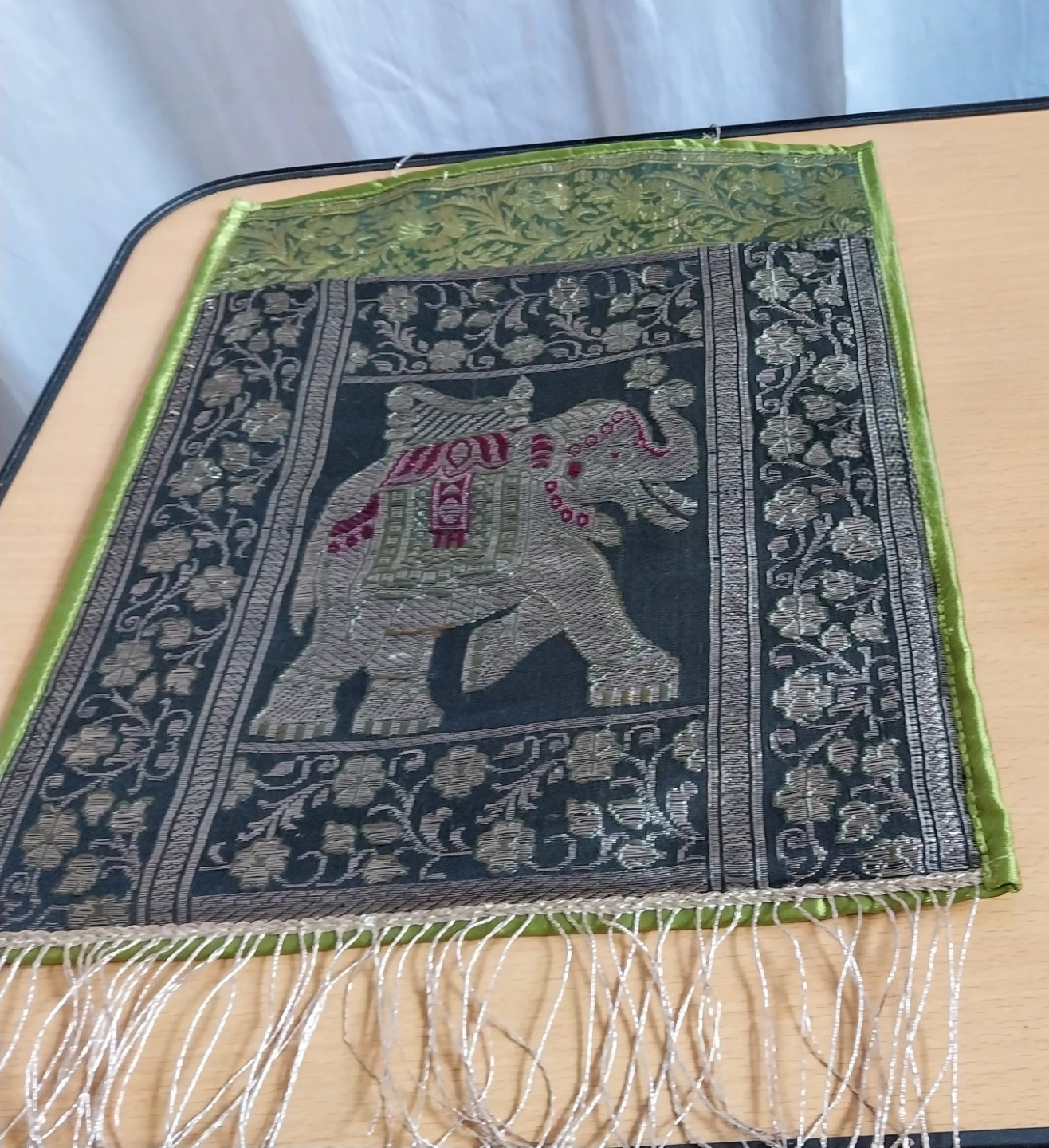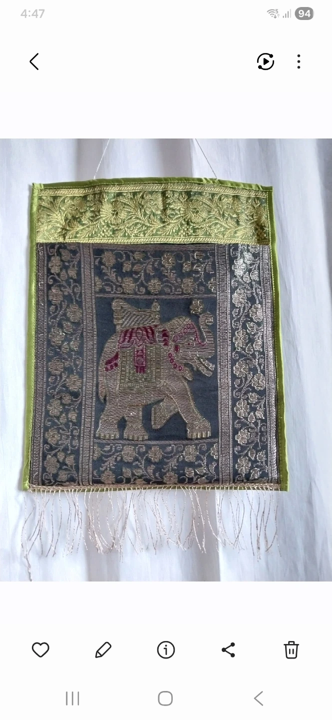 This is a lovely decorative tapestry featuring an elephant motif. It's made from brocade fabric with silver and gold thread accents. It includes decorative fringe at the bottom.
