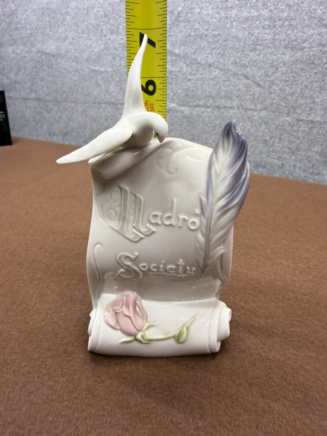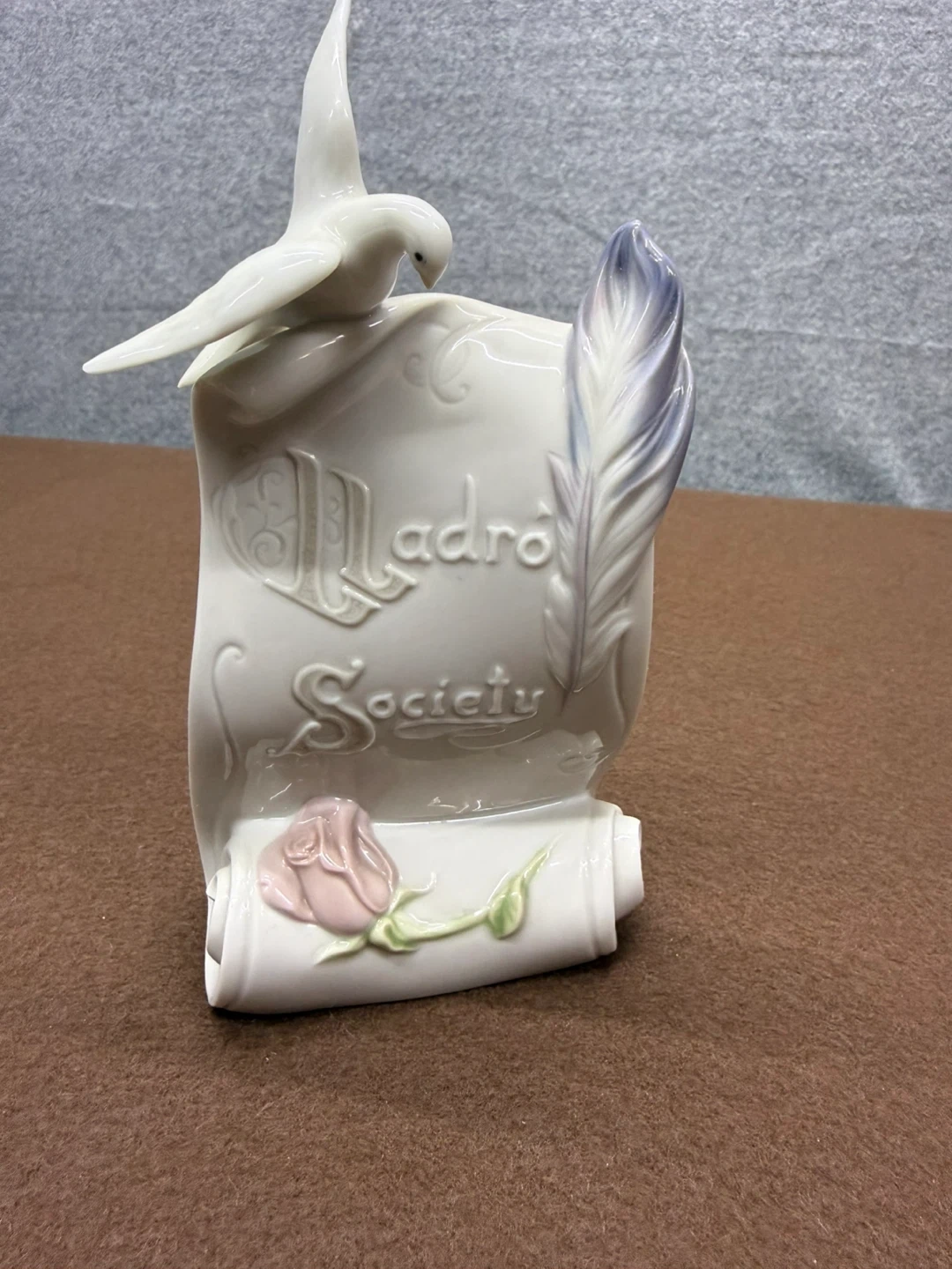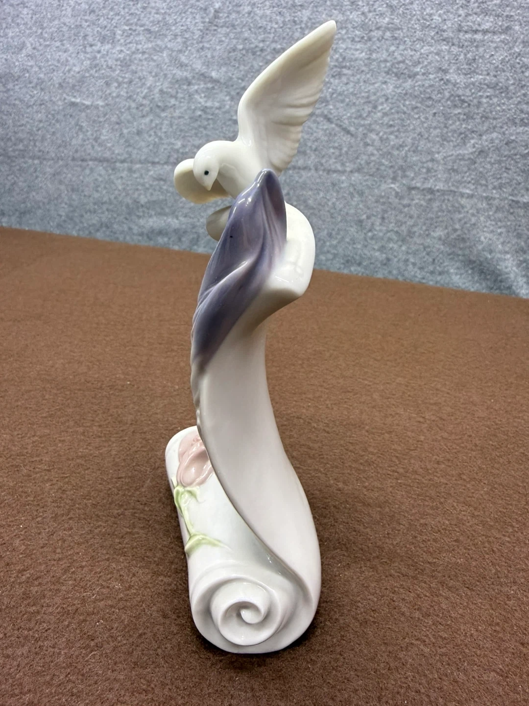 This is a Lladro Society figurine featuring a dove, feather, and rose. It's made of glazed porcelain. This piece would make a lovely decorative item.