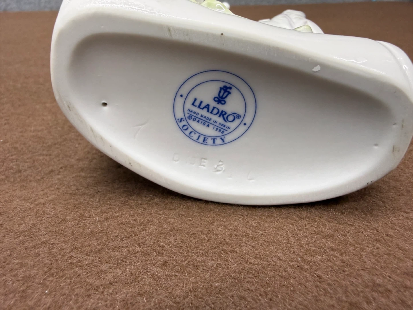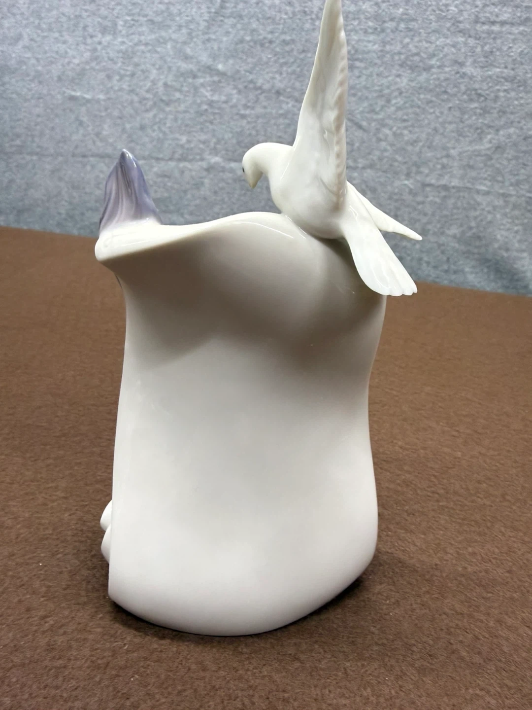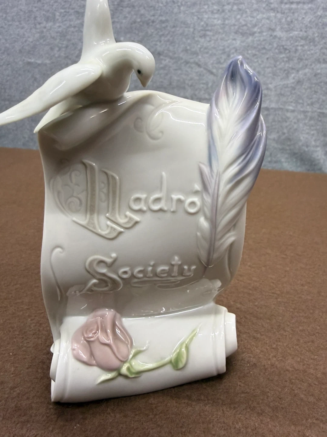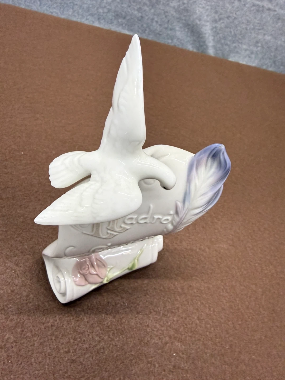 This is a Lladro Society figurine featuring a dove, feather, and rose. It's made of glazed porcelain. This piece would make a lovely decorative item.