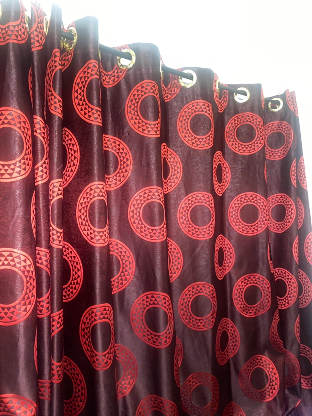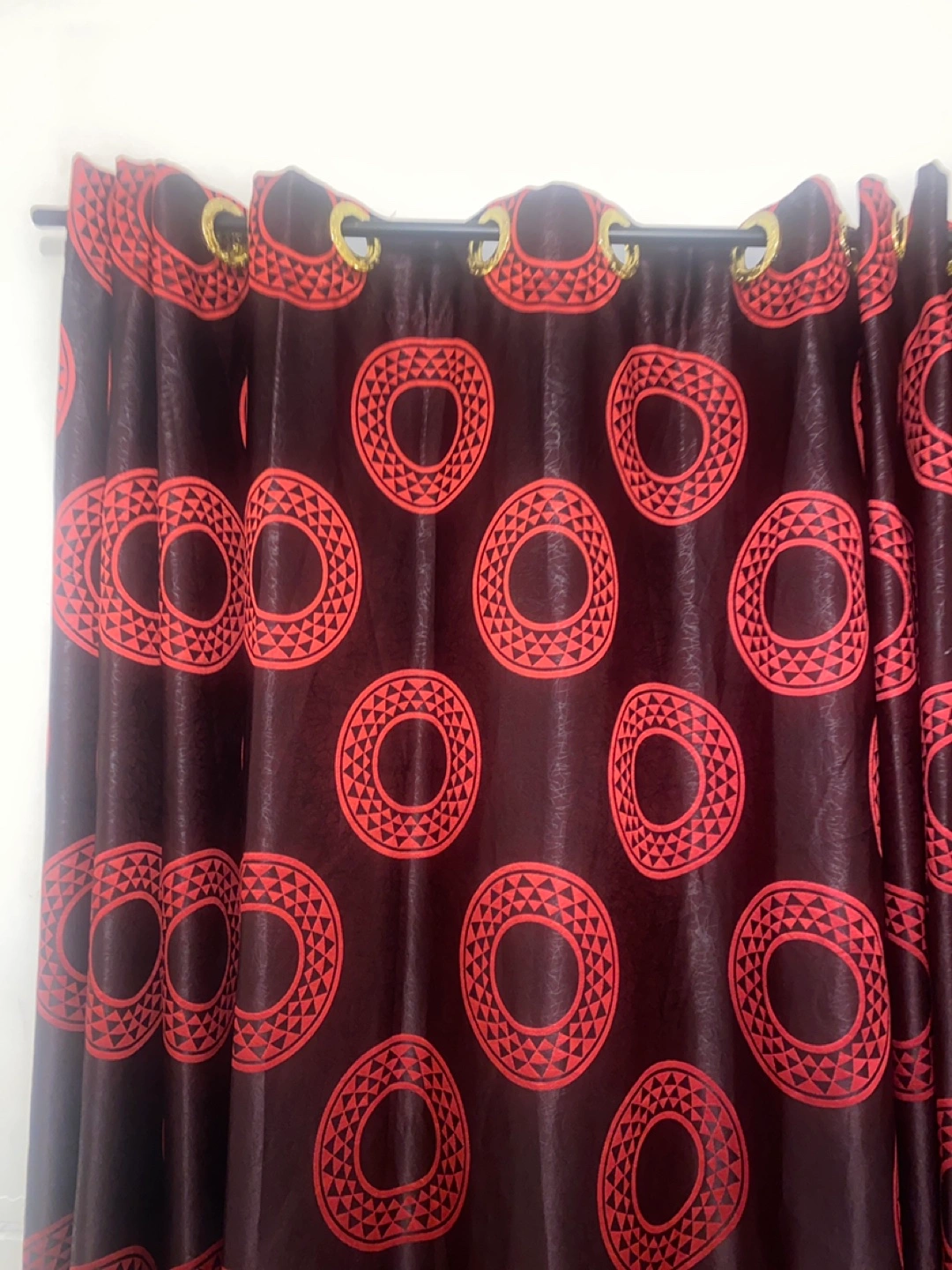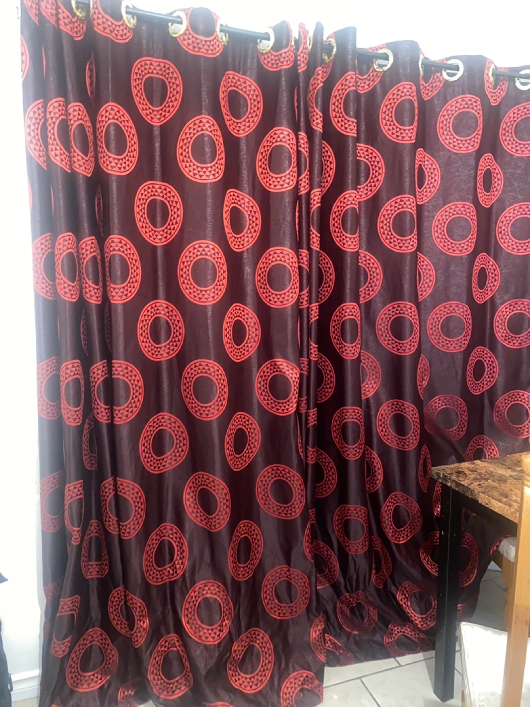 Set of 2 maroon curtains. Features a repeating geometric pattern in dark red. Grommet top for easy hanging. Good condition. Pick up location Royal York and Mimico