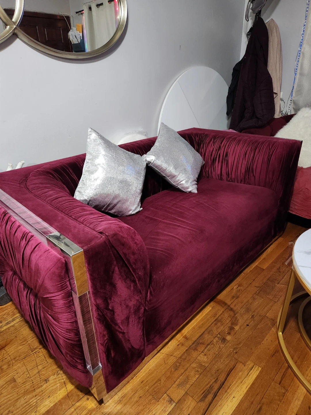 This stylish velvet sofa comes in a deep burgundy color. It features elegant channel tufting on the sides and arms, accented with sleek chrome and clear acrylic trim. Two sparkling silver throw pillows are included. It's a beautiful statement piece for any living room!