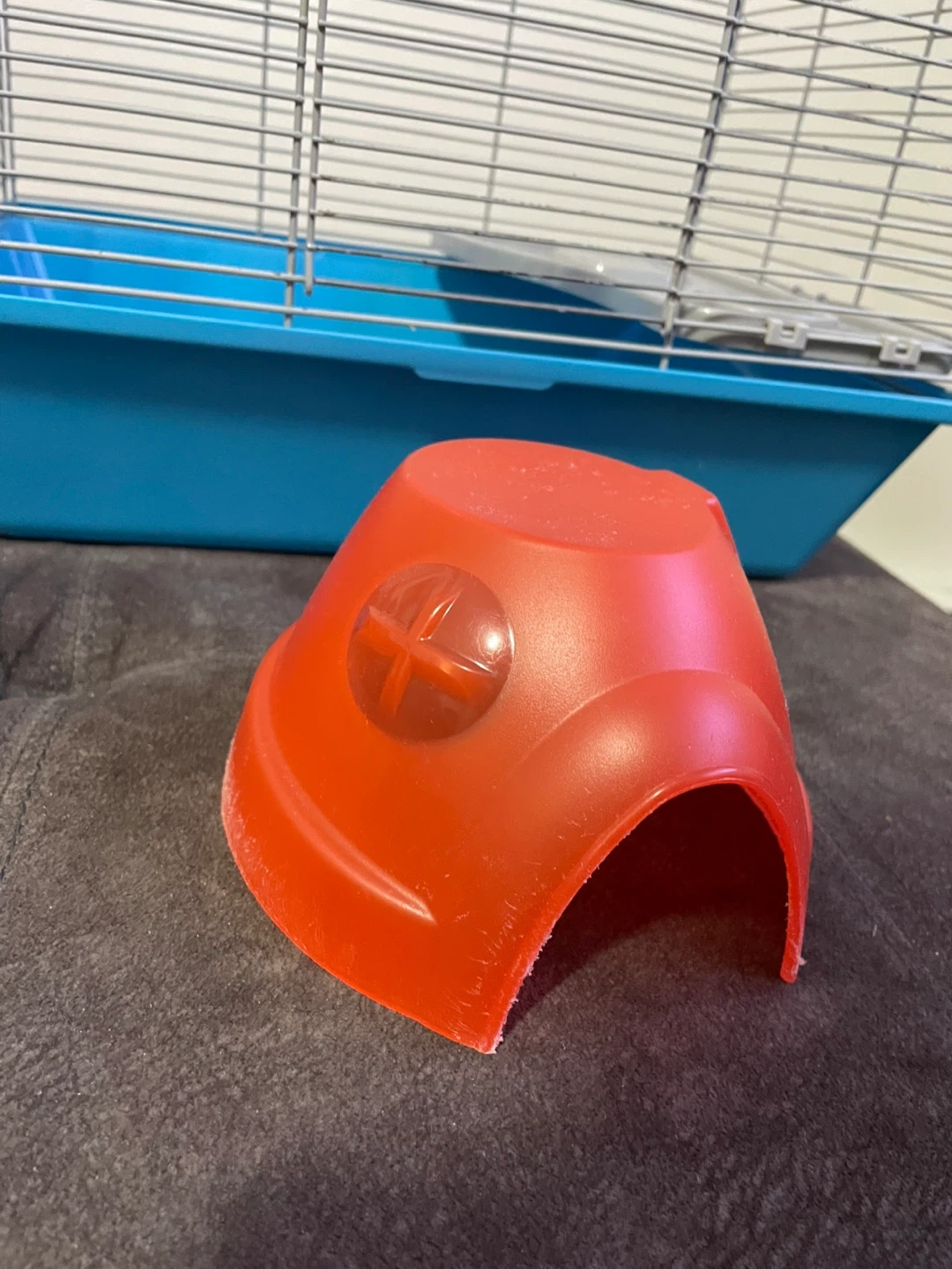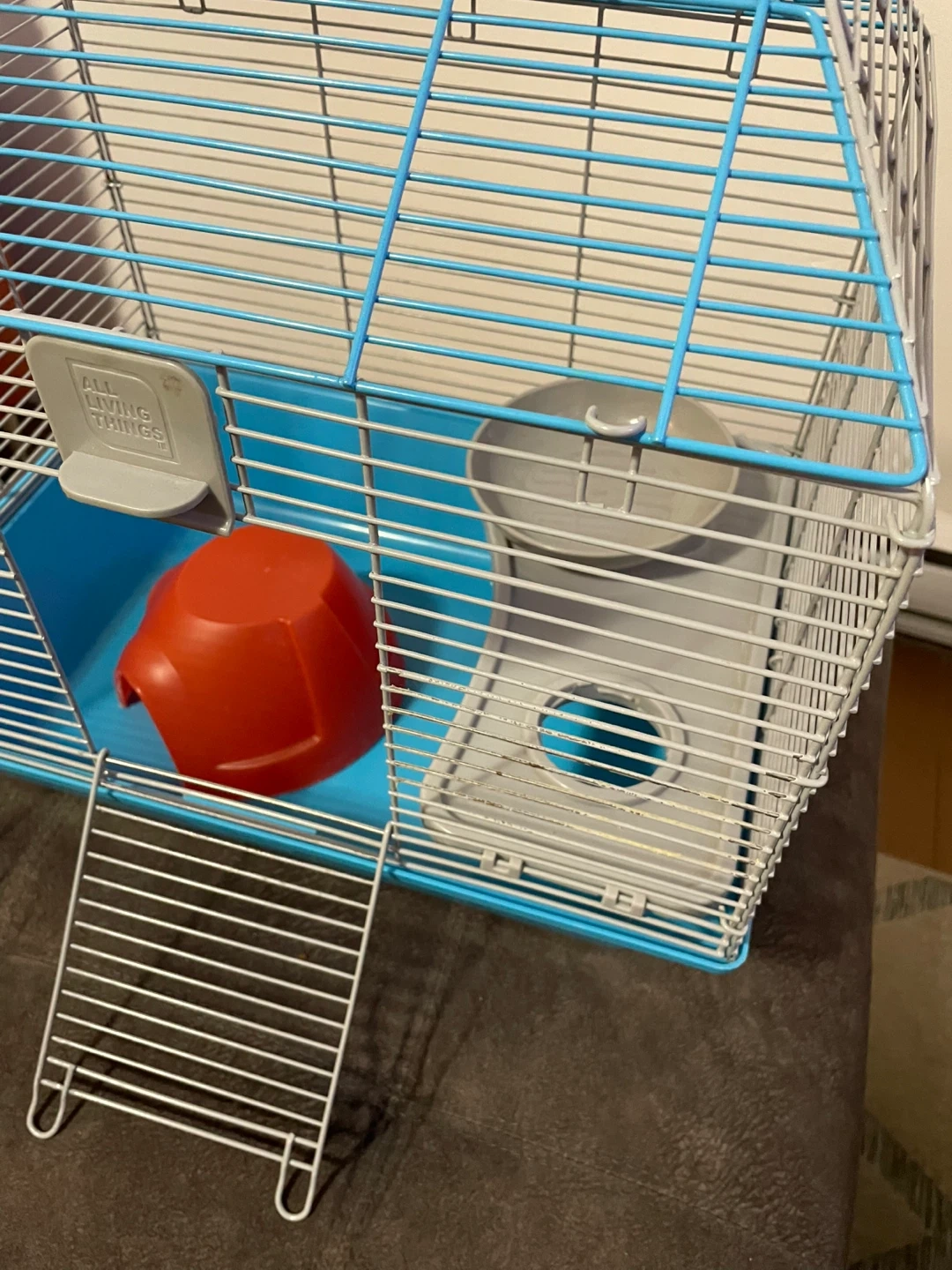 This is an All Living Things medium sized hamster cage. It comes with a blue base, wire top, food bowl, and a red hideout. The cage and the hide have a little damage, the bowl is brand new. Includes a ladder and a removable level. Perfect for your little friend🐹