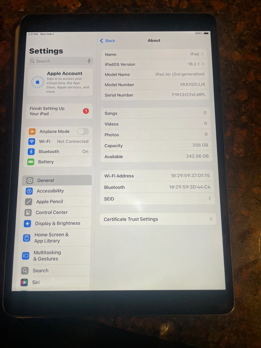 This is an Apple iPad Air (3rd generation) with 256GB of storage. It runs on iPadOS 18.2.1 and has a model number of MUUQ2LL/A. The iPad has 242.56 GB available.