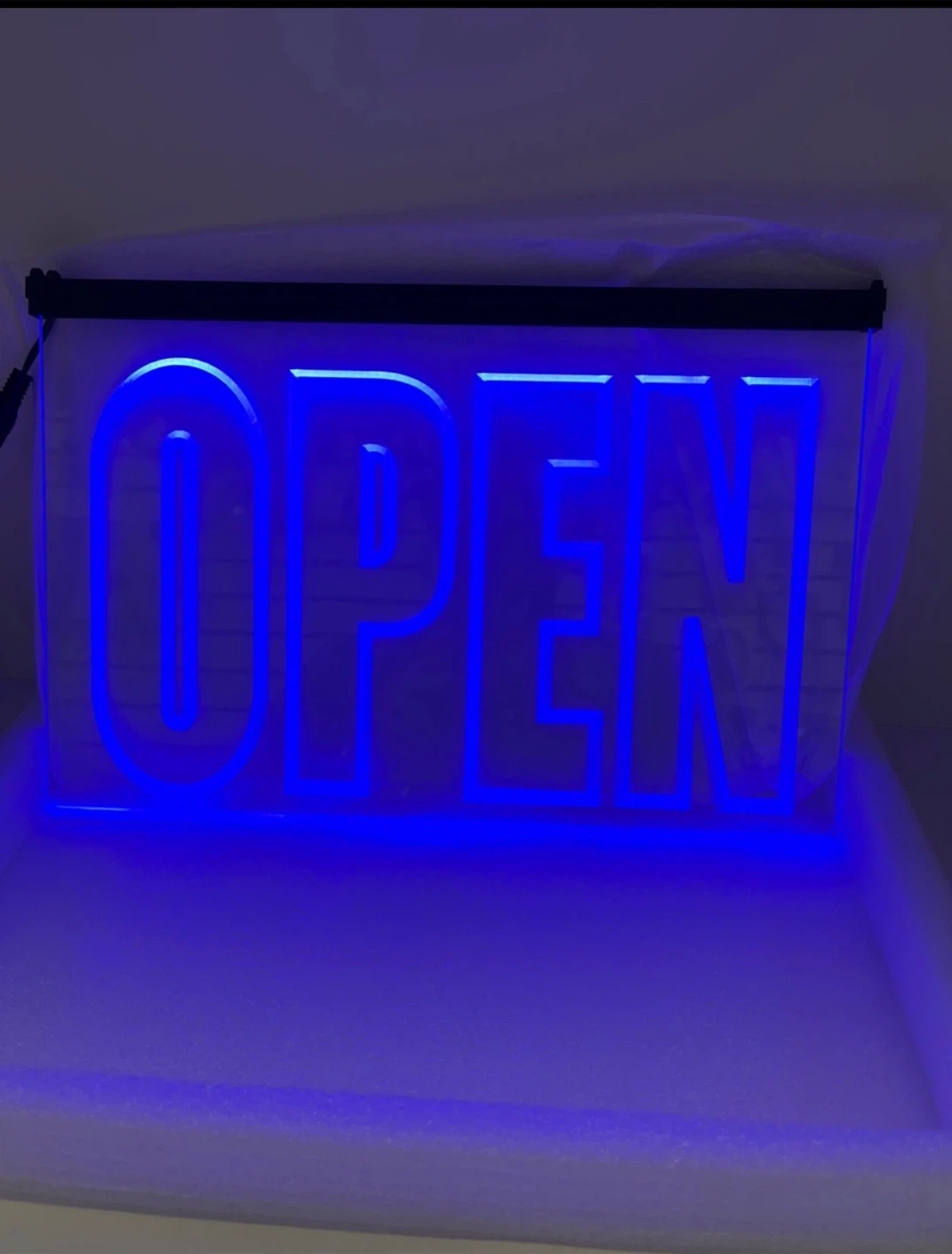 This bright blue LED "OPEN" sign is perfect for businesses wanting to attract customers. It comes with a power adapter and hanging chain. The sign is illuminated by vibrant blue LEDs, making it highly visible.
