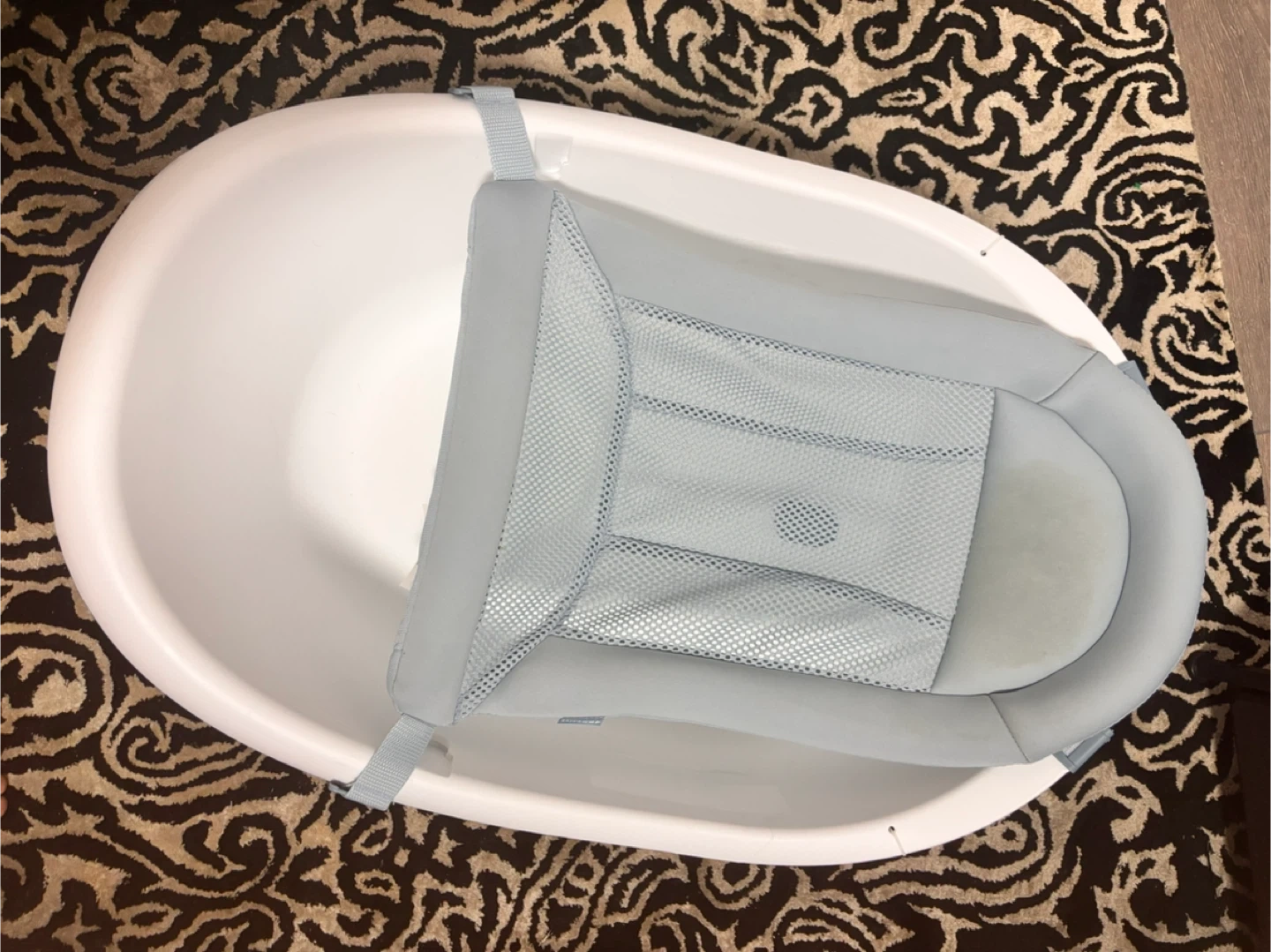 White plastic baby bathtub with a light blue mesh sling. It's designed for newborns and infants. The sling supports your baby during bath time. Used just twice. Selling as we realized it was too big for our use.