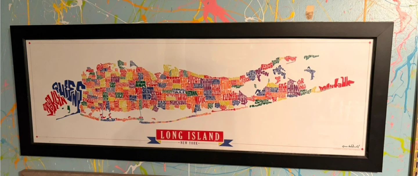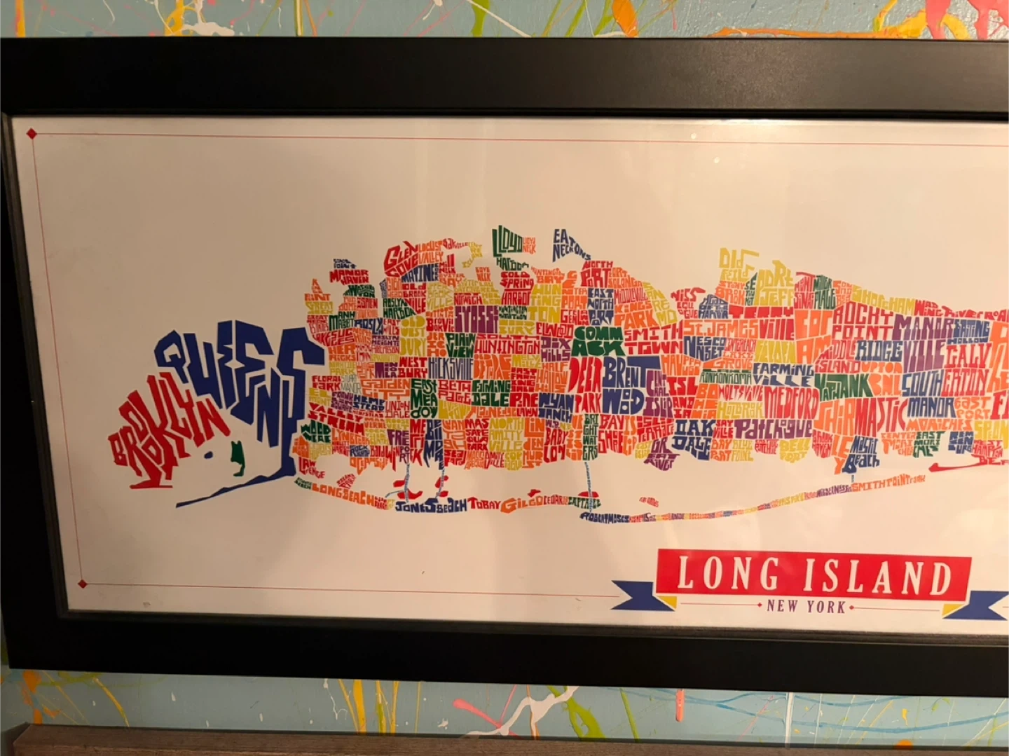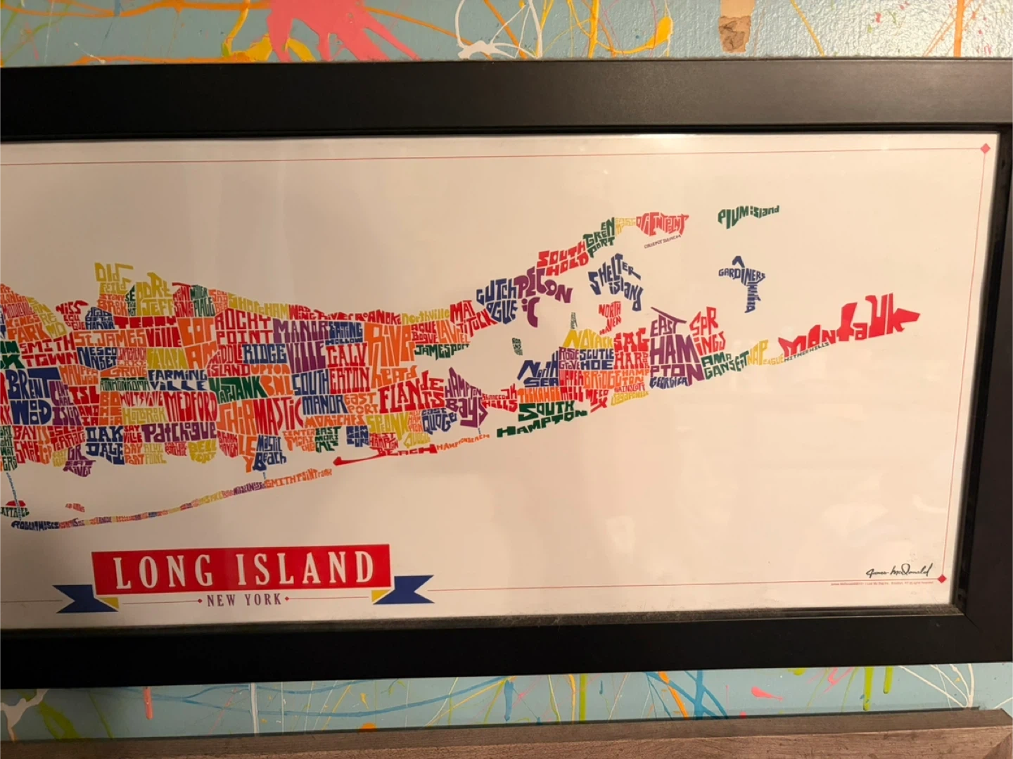 This framed art piece showcases Long Island, New York, with its boroughs and towns creatively depicted in colorful text. It's a unique way to represent the geography of the area. The print is framed in black.