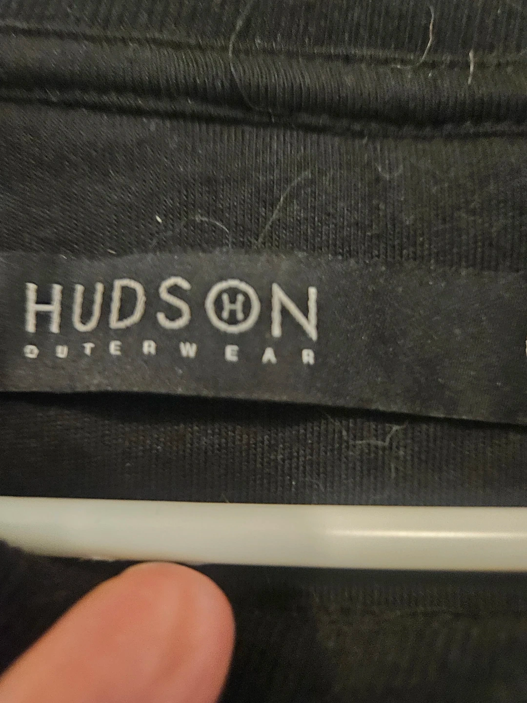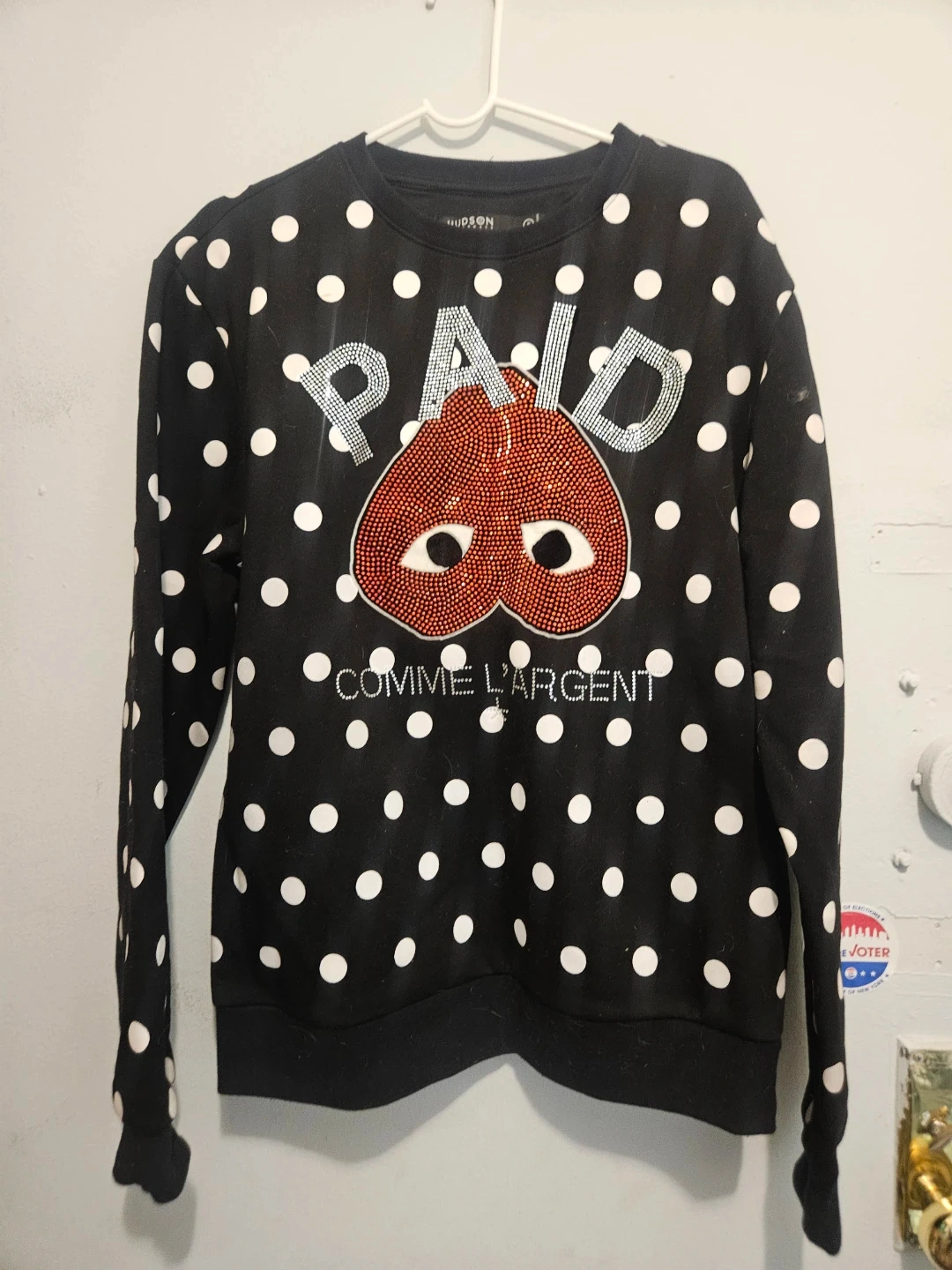 Black sweatshirt with white polka dots and a graphic design. Features "PAID COMME L'ARGENT" text with rhinestone embellishments. Made by Hudson Outerwear.