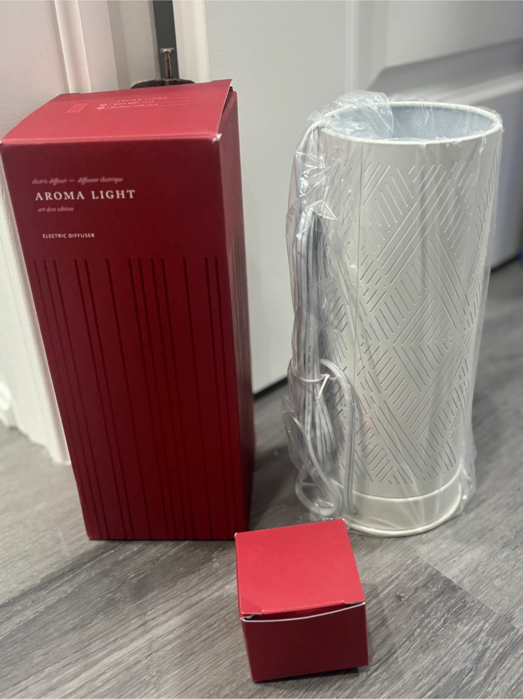 This is an Aroma Light electric diffuser. It's an art deco edition with a decorative patterned finish. Includes the power cord/ 1 Halogen bulb/water dish/instruction manual and is in its original box.