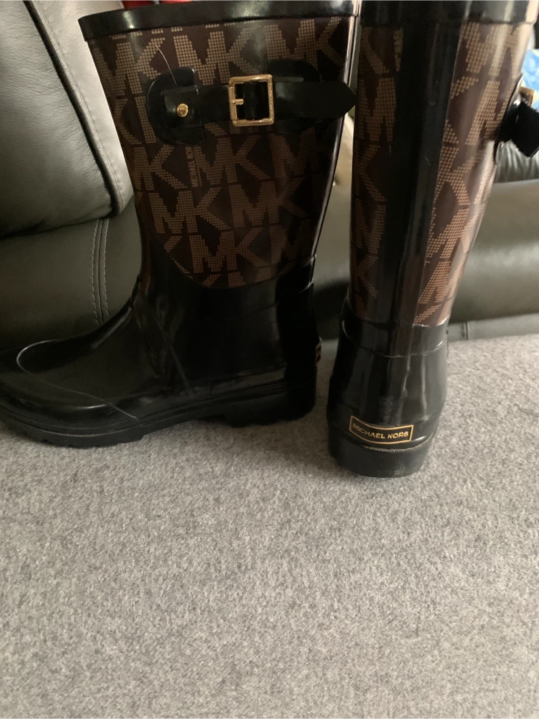 Black /Brown glossy rain boots with the signature MK logo print. Features a side buckle detail. Perfect for rainy days!
