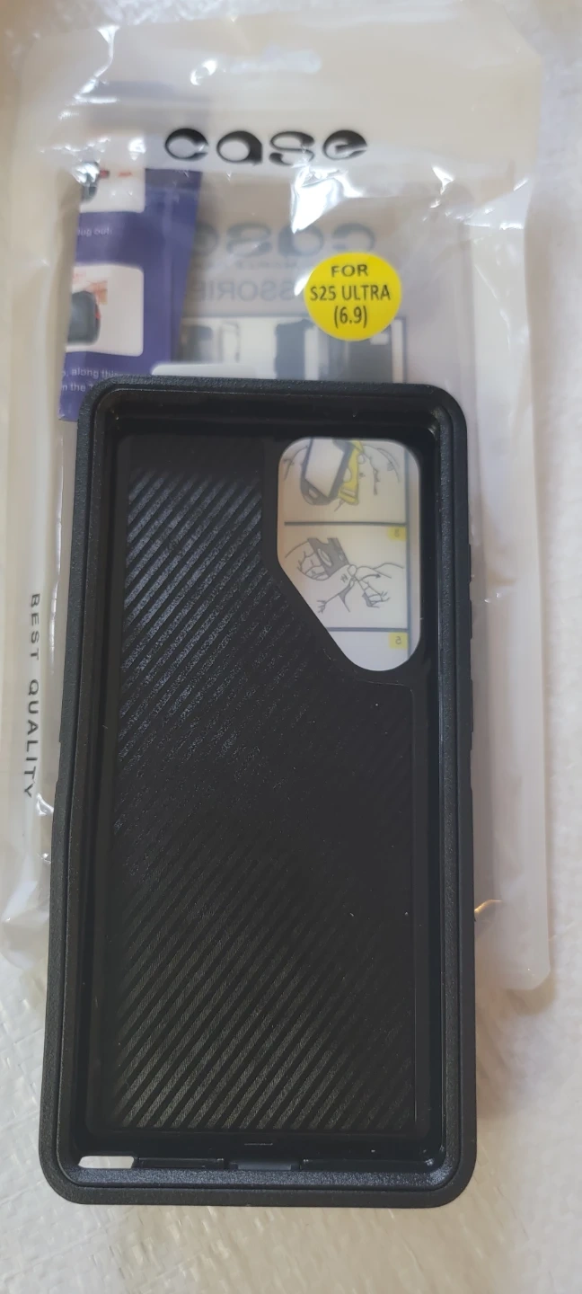 OtterBox Defender series phone case. Fits Samsung S25 Ultra (6.9 inch screen). Durable, multi-layer protection against drops and dust. Includes belt clip holster.