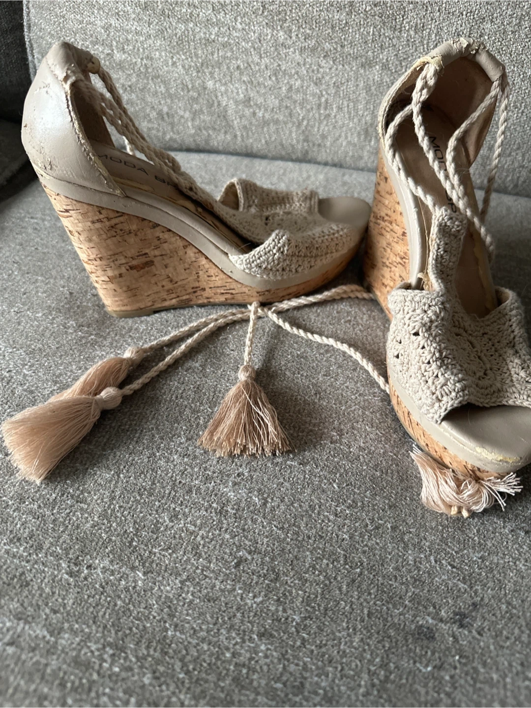 Cute Moda Brazil wedge sandals with a cork heel and tassel details. They show some wear, but still have lots of life left! Barely worn