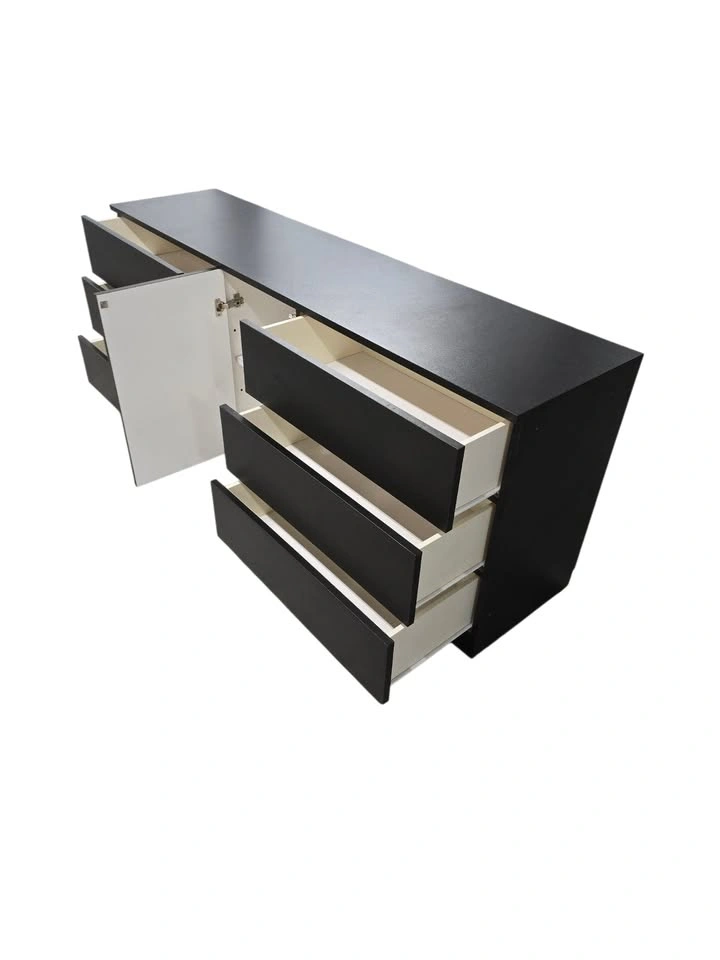 Modern minimalist black dresser with 6 drawers and a central cabinet. Dimensions: Width: 75" Height: 30" Depth: 18" Pick up in New Fairfield, CT, 06812 Quality & Care: All furniture is carefully inspected for mold and lead — safety is our priority. Drawers and hardware are checked to ensure everything functions smoothly. Interiors are cleaned and waxed, so your dresser arrives fresh, smooth, and ready to enjoy. Payment options: Cash, Zelle.