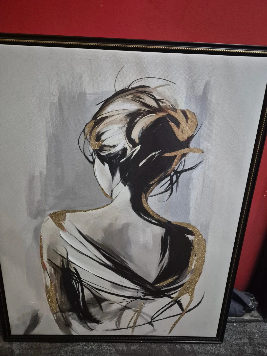 This framed wall art features a modern abstract print of a woman's silhouette. The design incorporates black and white brushstrokes with striking gold glitter accents. It's ready to hang and adds a touch of elegance to any room!