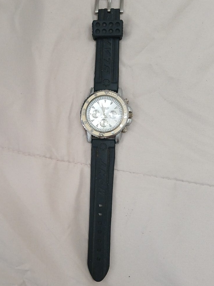 Selling a Montblanc men's watch with a black rubber strap. The watch has a silver-tone dial and a stainless steel case. It's in good condition and ready for a new owner!