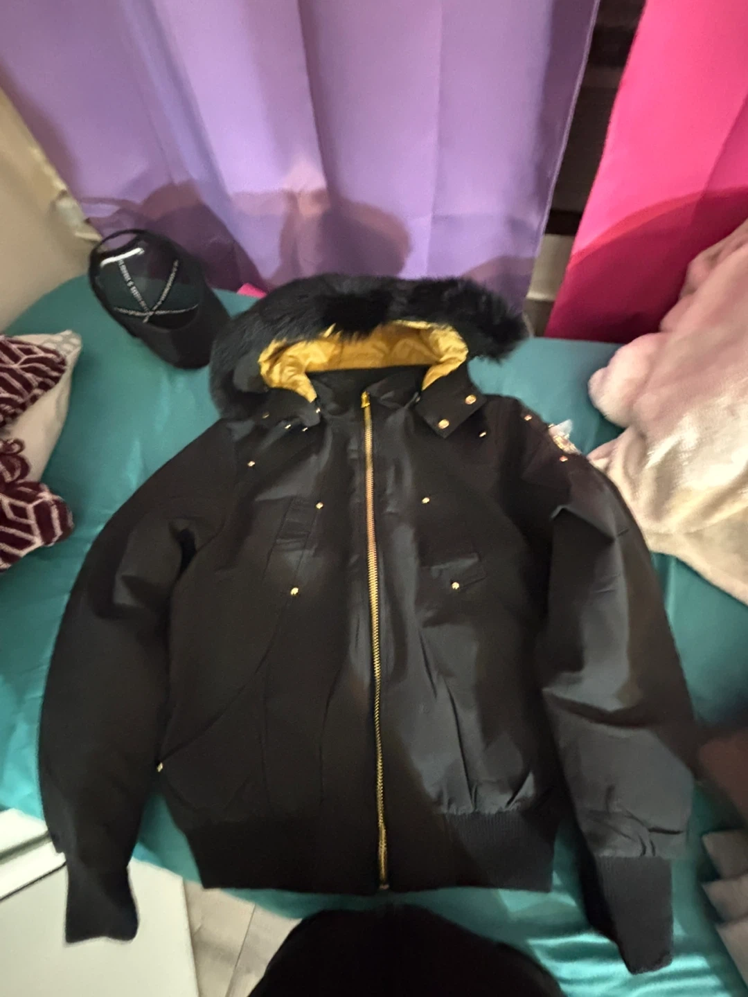 10Selling a Moose Knuckles black bomber jacket. It has a fur hood and gold accents. It is in new condition.