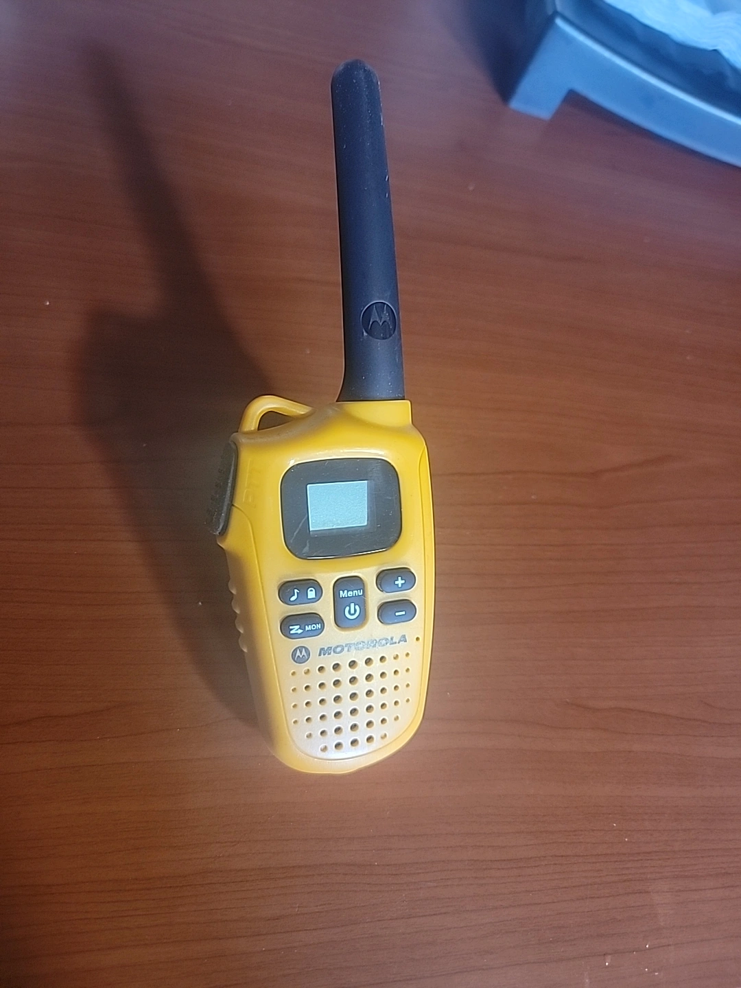Selling a yellow Motorola two-way radio. It appears to be in good condition and includes a clip. It uses AAA batteries. Please let me know if you have any questions!