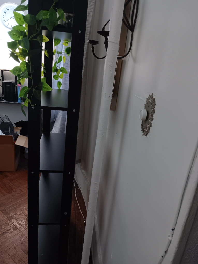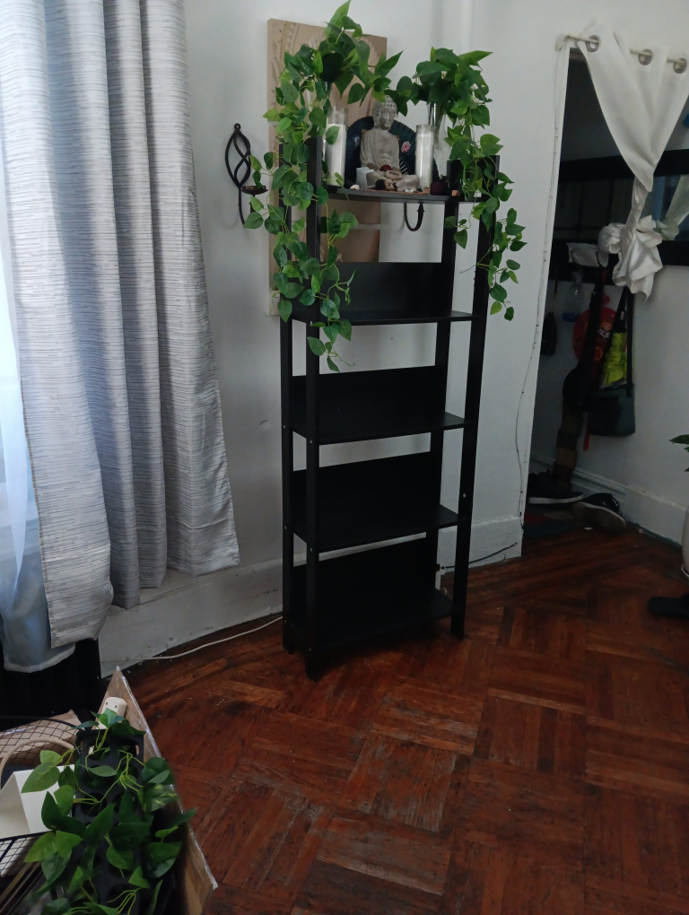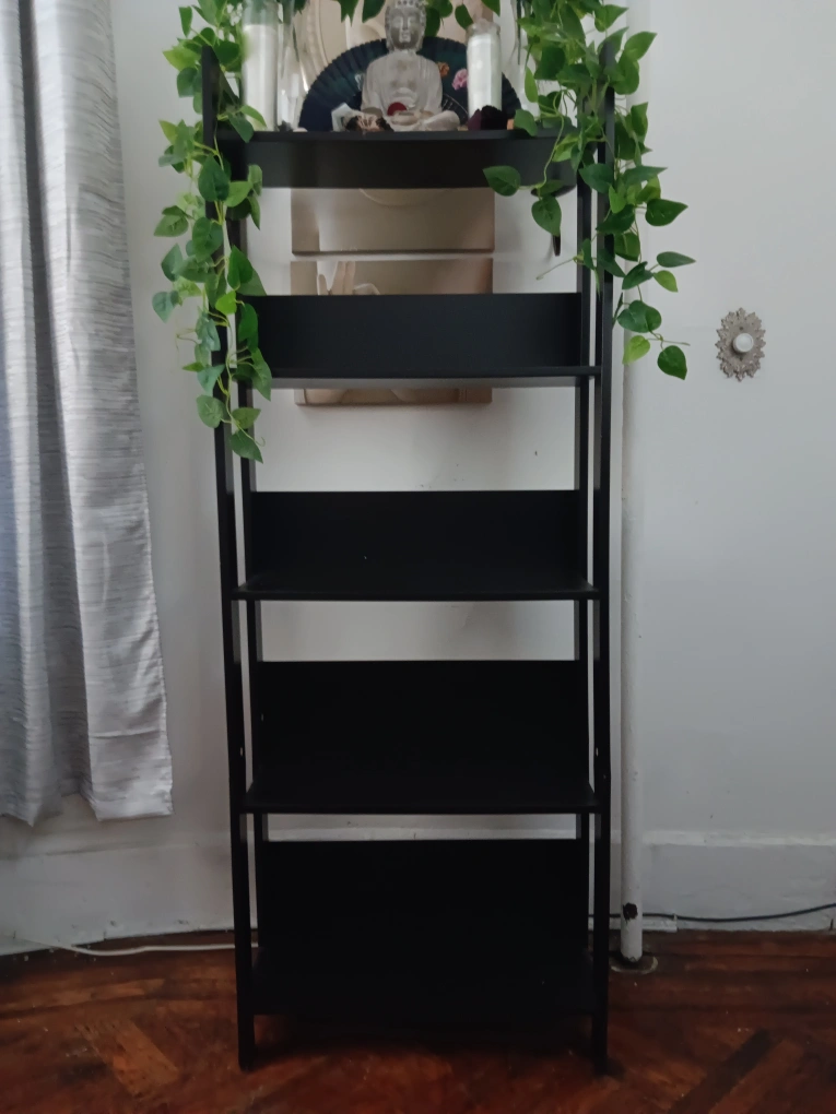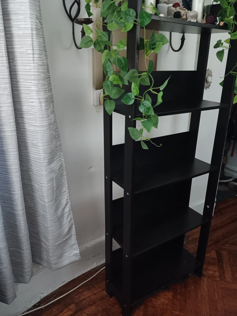 Selling a black shelving unit in good condition! It's perfect for displaying your favorite items or organizing your space. It's a stylish and functional piece that will fit well in any room of your home. Five tier shelf dark mahogany brown "wood looking" light weight and Can be separated into two small shelves