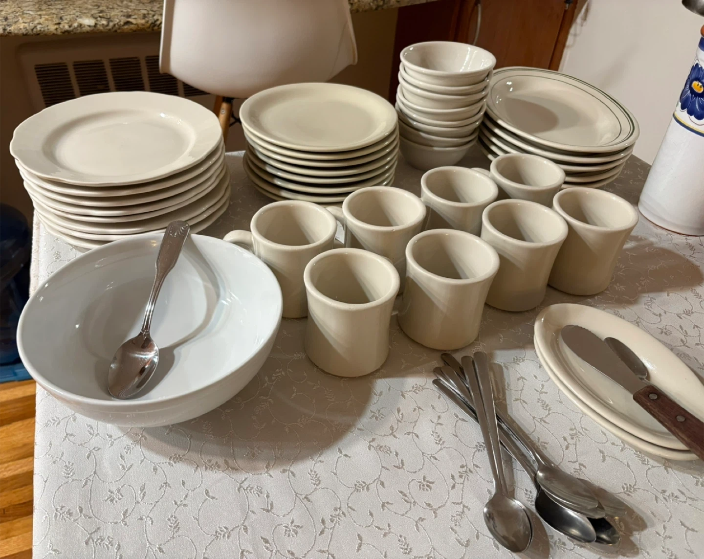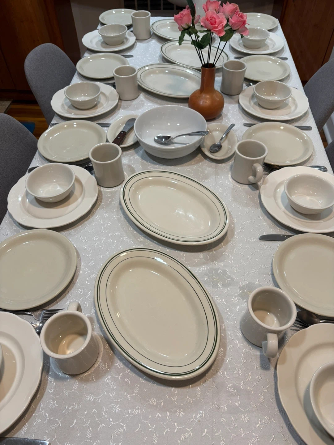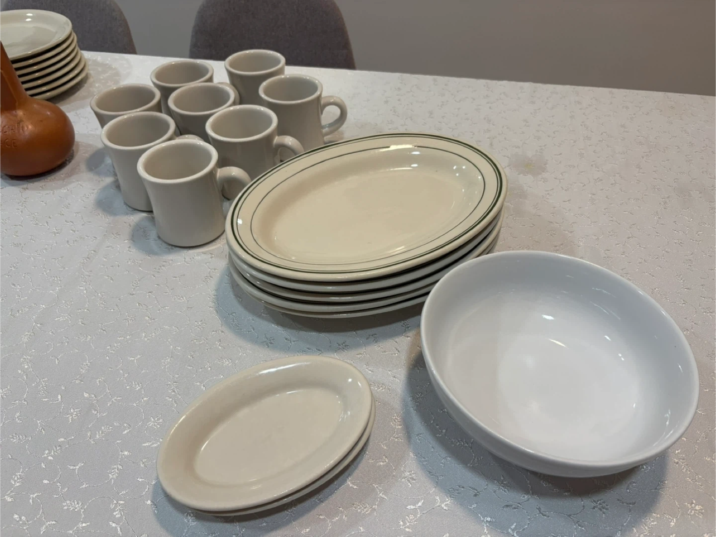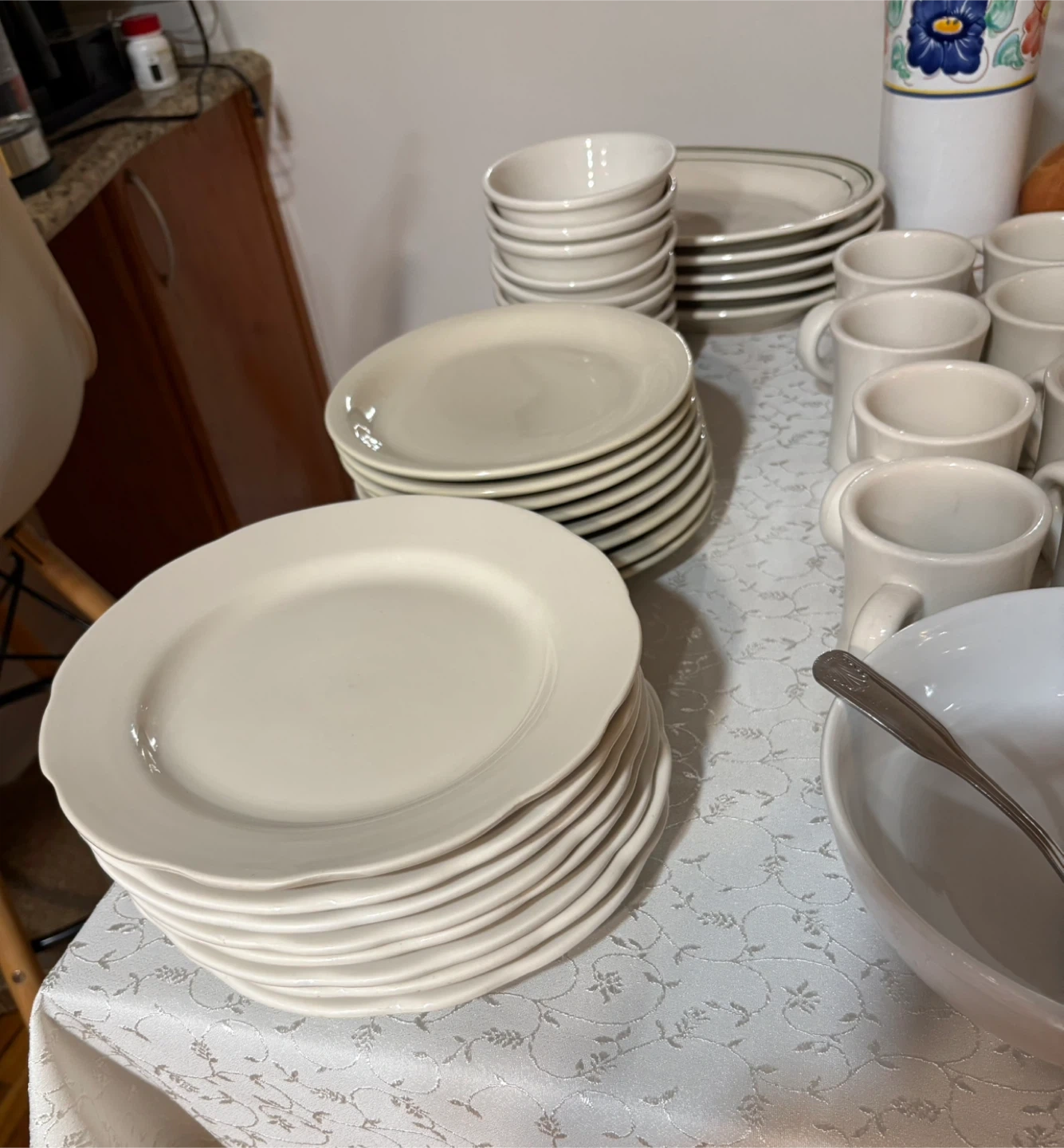 This is a large set of cream-colored dinnerware. It includes dinner plates, mugs, several small bowls, and larger serving platters. Also includes a set of silverware and serving utensils. Perfect for hosting events or for a large family!