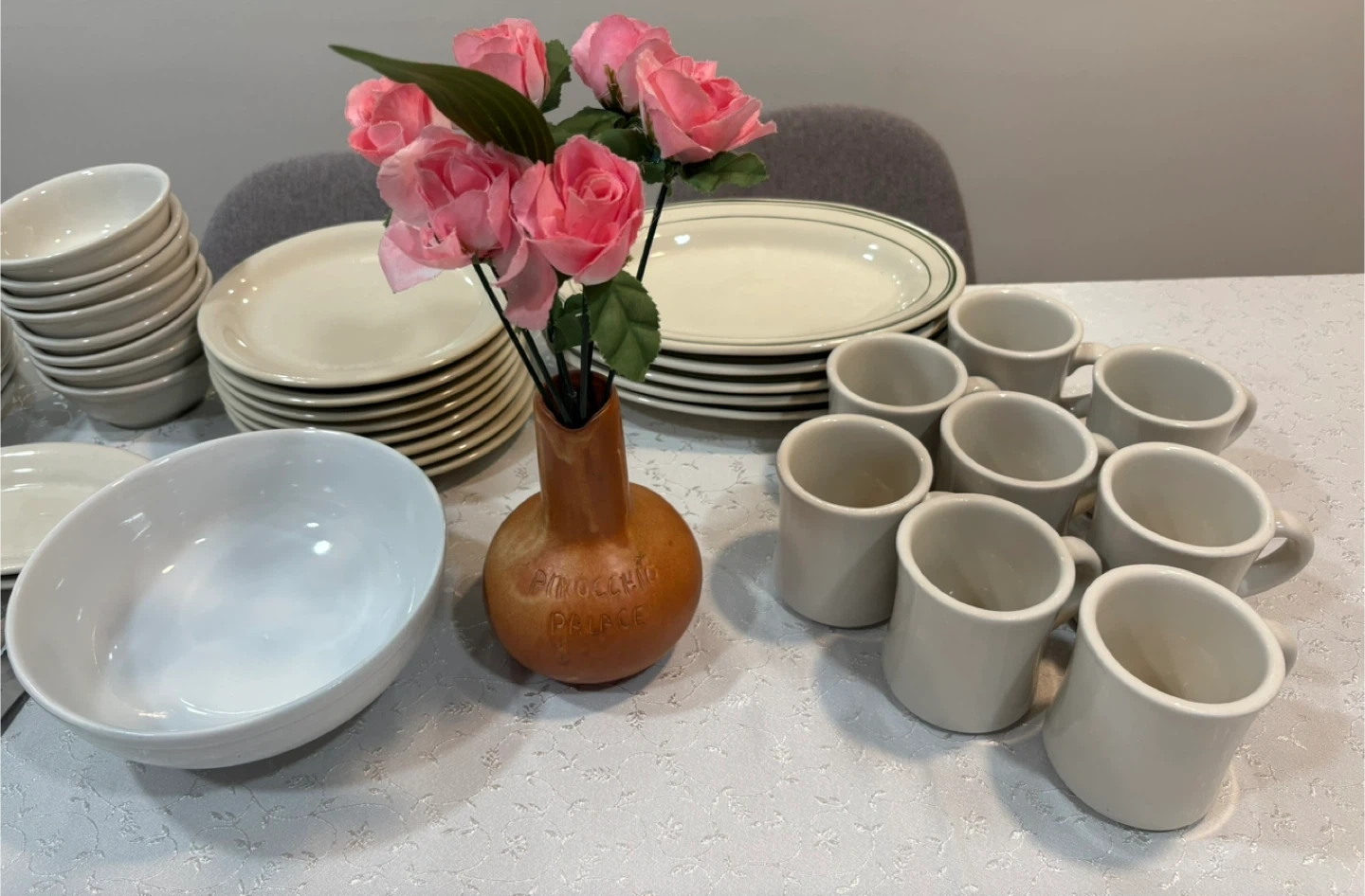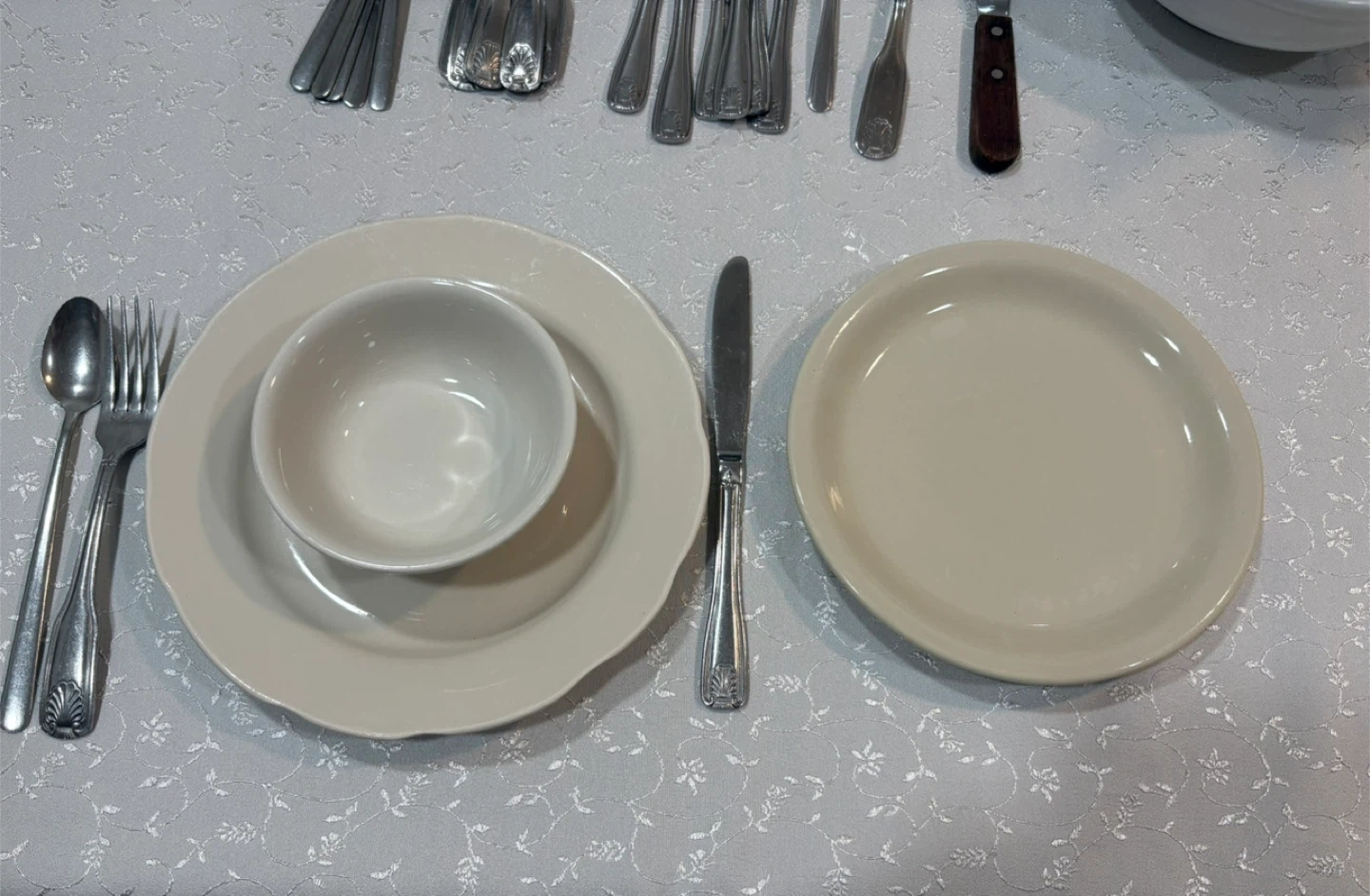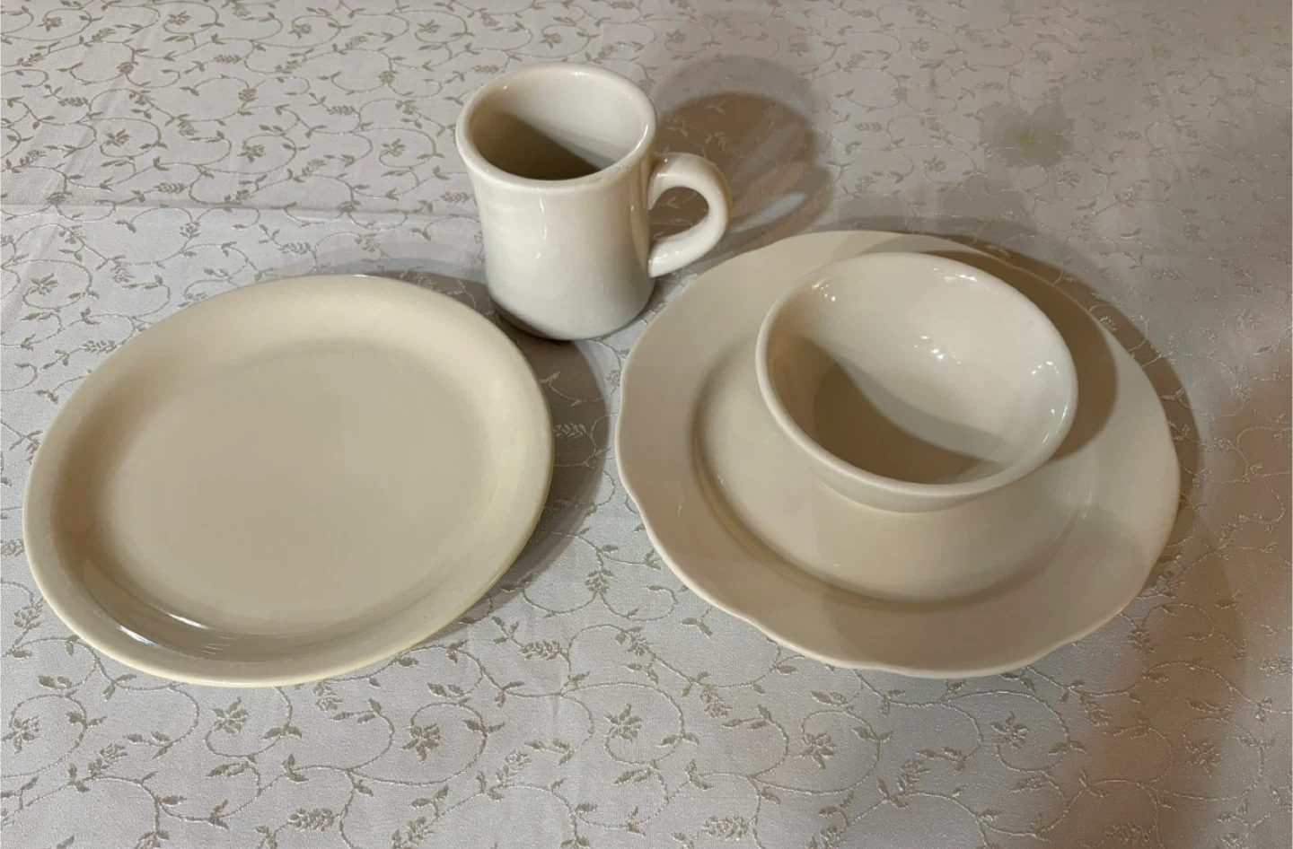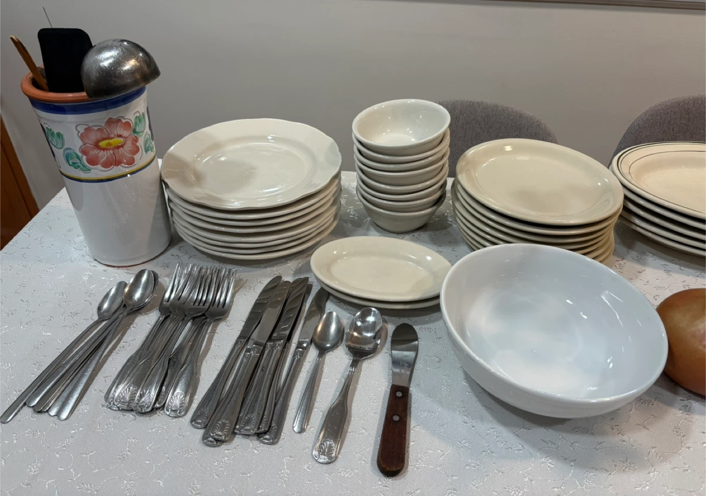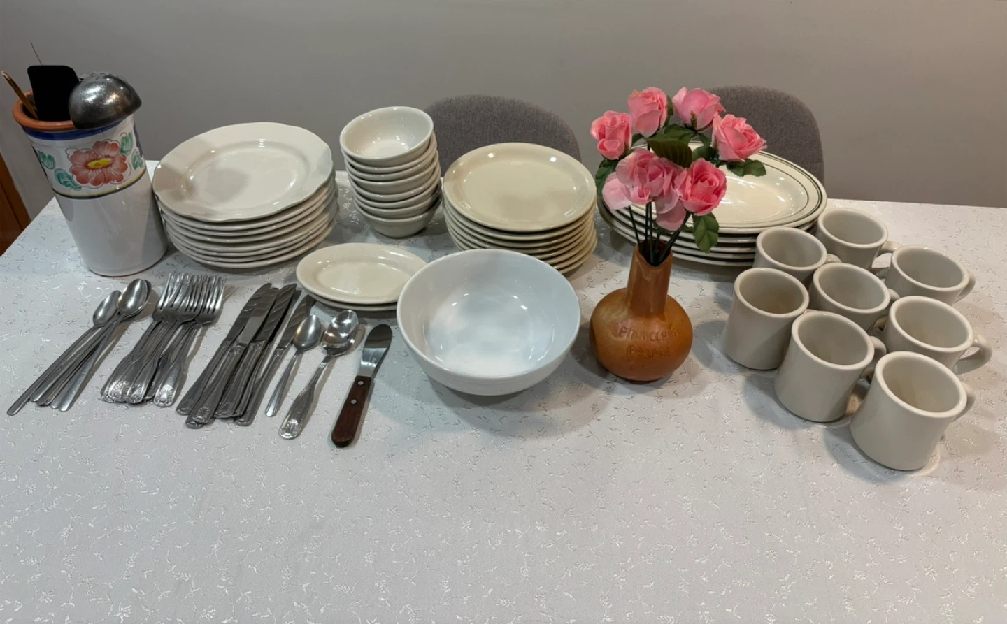This is a large set of cream-colored dinnerware. It includes dinner plates, mugs, several small bowls, and larger serving platters. Also includes a set of silverware and serving utensils. Perfect for hosting events or for a large family!