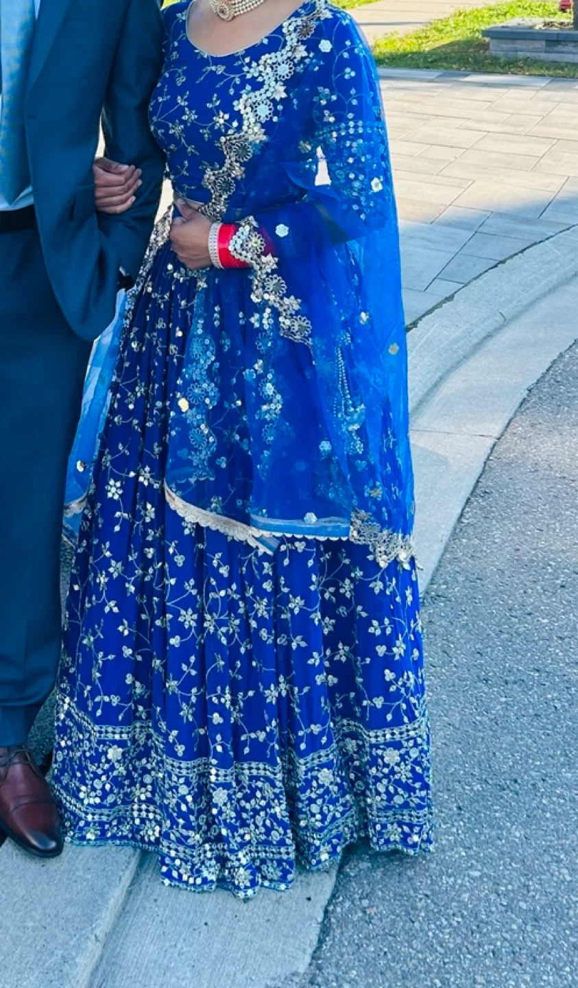 Beautiful blue lehenga choli set with silver floral embroidery. It's in great condition as I have only worn this once and perfect for a special occasion!