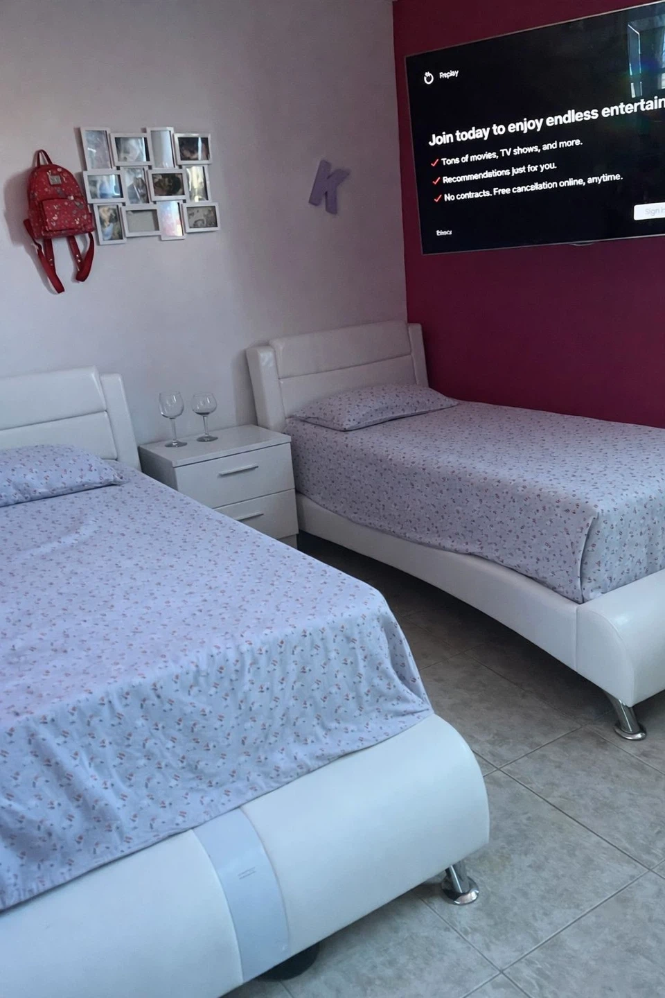 Two white twin bed frames with headboards. Includes bedding with a small floral pattern. Beds have a modern, curved design with metal legs. Perfect for a guest room or shared children's room!