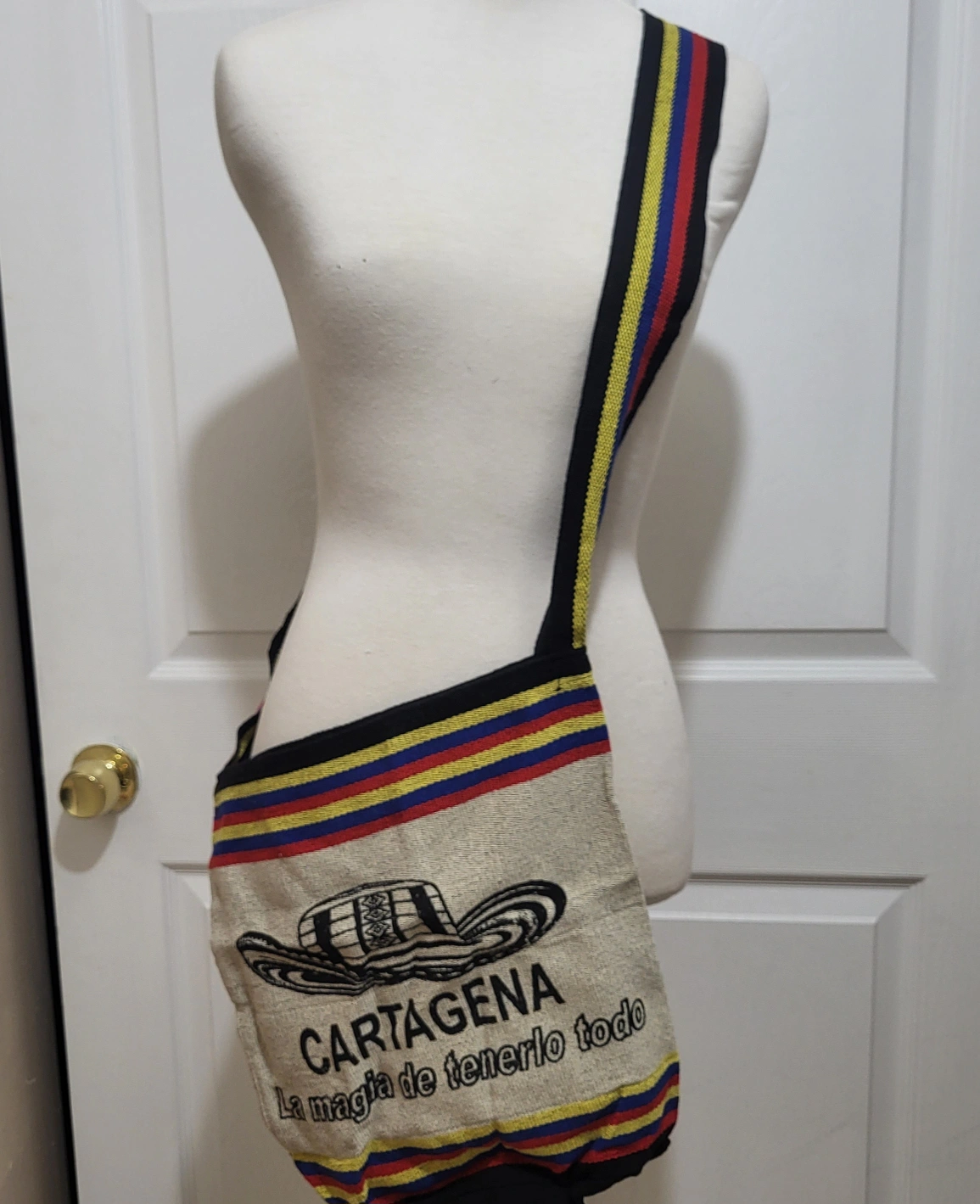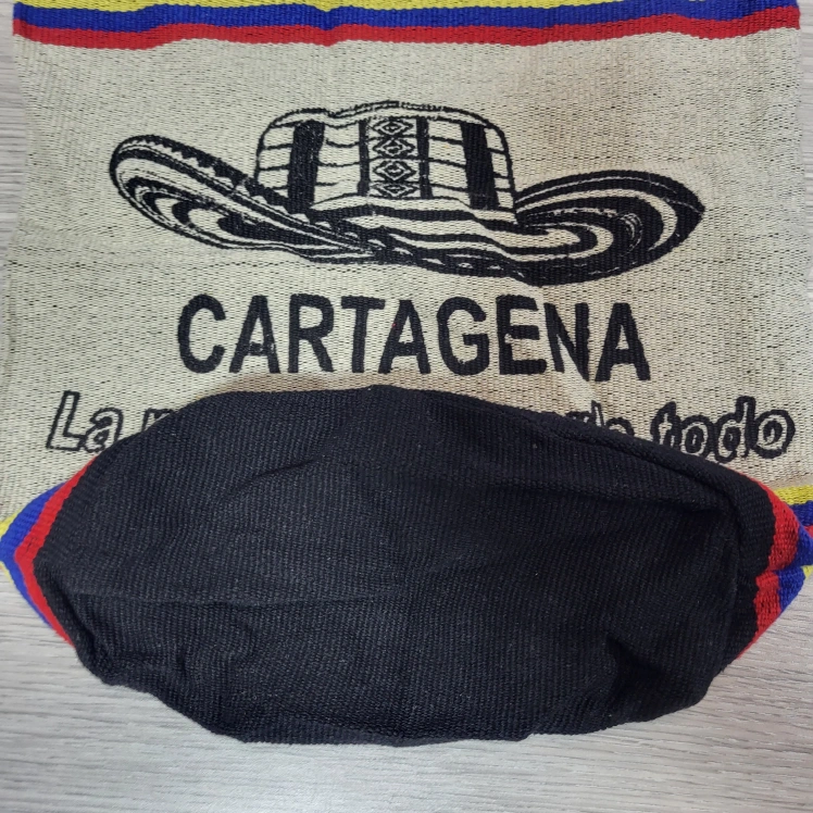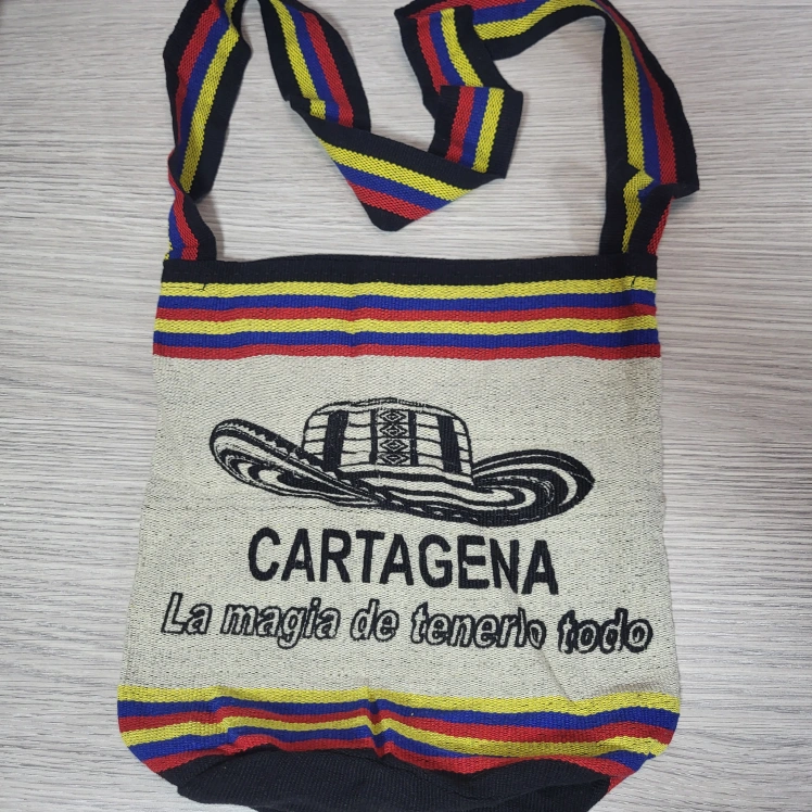 Introducing a fun and vibrant crossbody mochila bag from Colombia. This colorful cream background bag is perfect for travel or casual occasions, with a 21" colorful crossbody strap handle in a multicolor design. The exterior is made of durable polyester material, adorned with Cartagena "La magia de tenerlo todo" in black bold letters, making it a great addition to your beach or as a Christmas present. The new bag is medium-sized and has a cylinder shape, making it easy to carry around. Features an open closure and it's very lightweight. Measuring approximately 11"Wx12"H