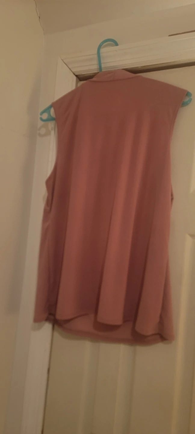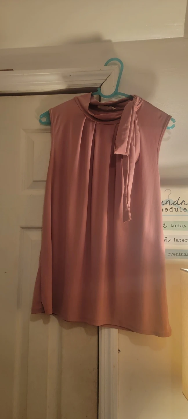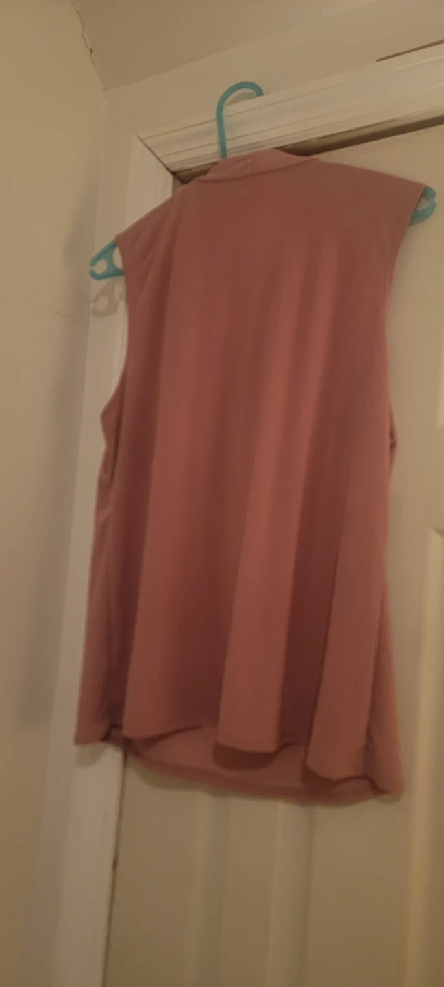 This pink sleeveless blouse features a mock neck with a decorative bow tie detail. It has a flattering pleated front. The fabric is lightweight and drapes nicely. Women's Size L.