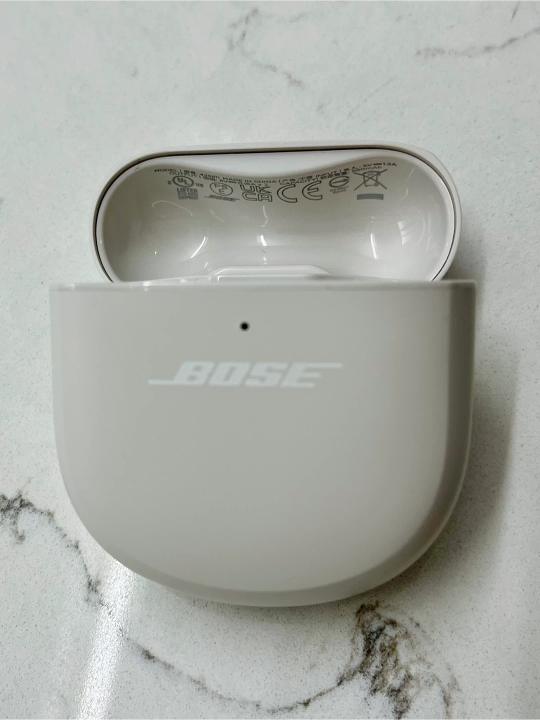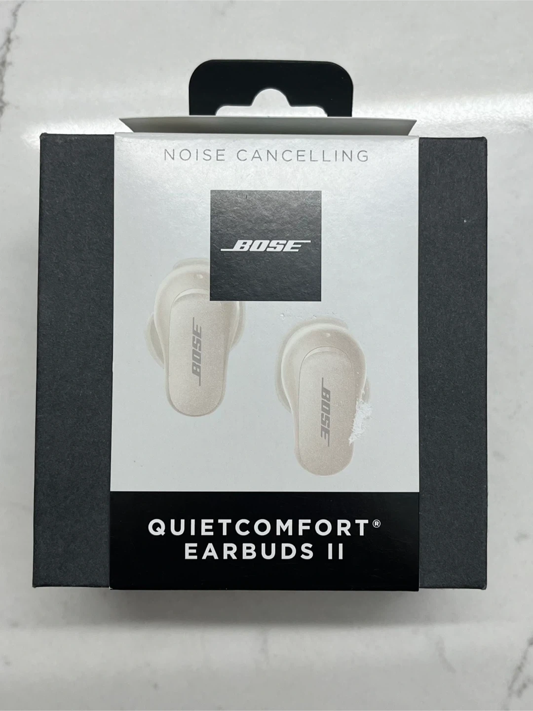 Includes Bose QuietComfort Earbuds II in white. Comes with charging case and multiple ear tip sizes for a custom fit. Also includes manual and original packaging. These earbuds offer immersive sound and superior noise cancellation.