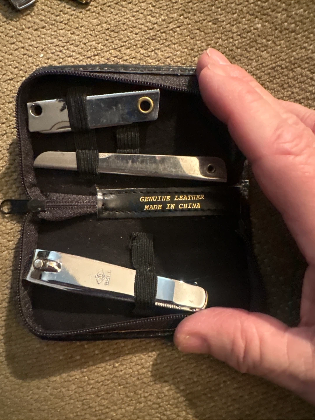 This manicure set comes in a genuine leather case. It includes nail clippers, a file, and other grooming tools. A handy travel kit for keeping nails tidy!