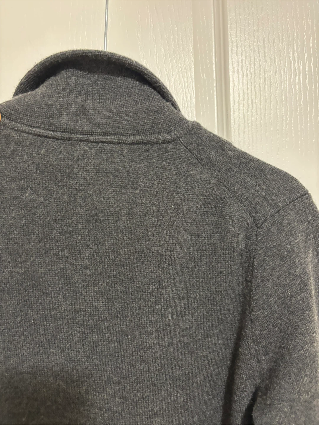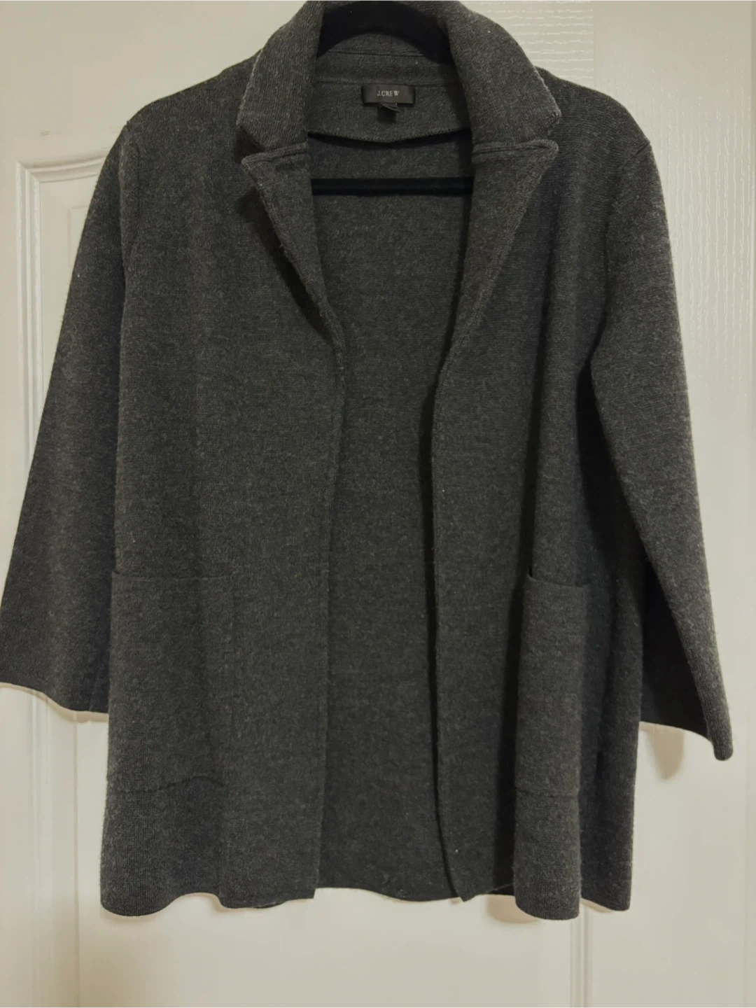 This J. Crew cardigan is made from 100% merino wool. It features a dark grey colour with pockets. It's a versatile layering piece.