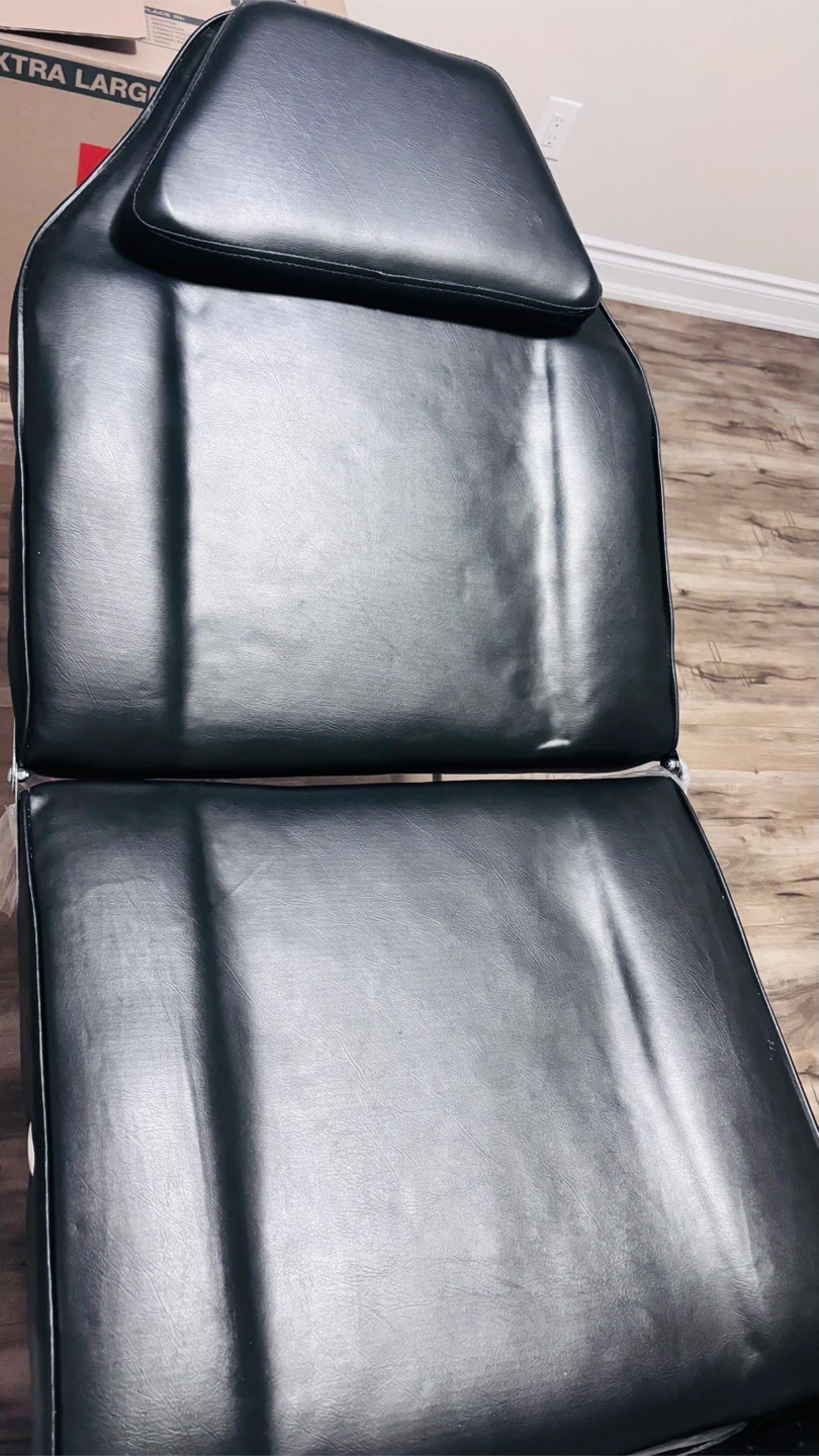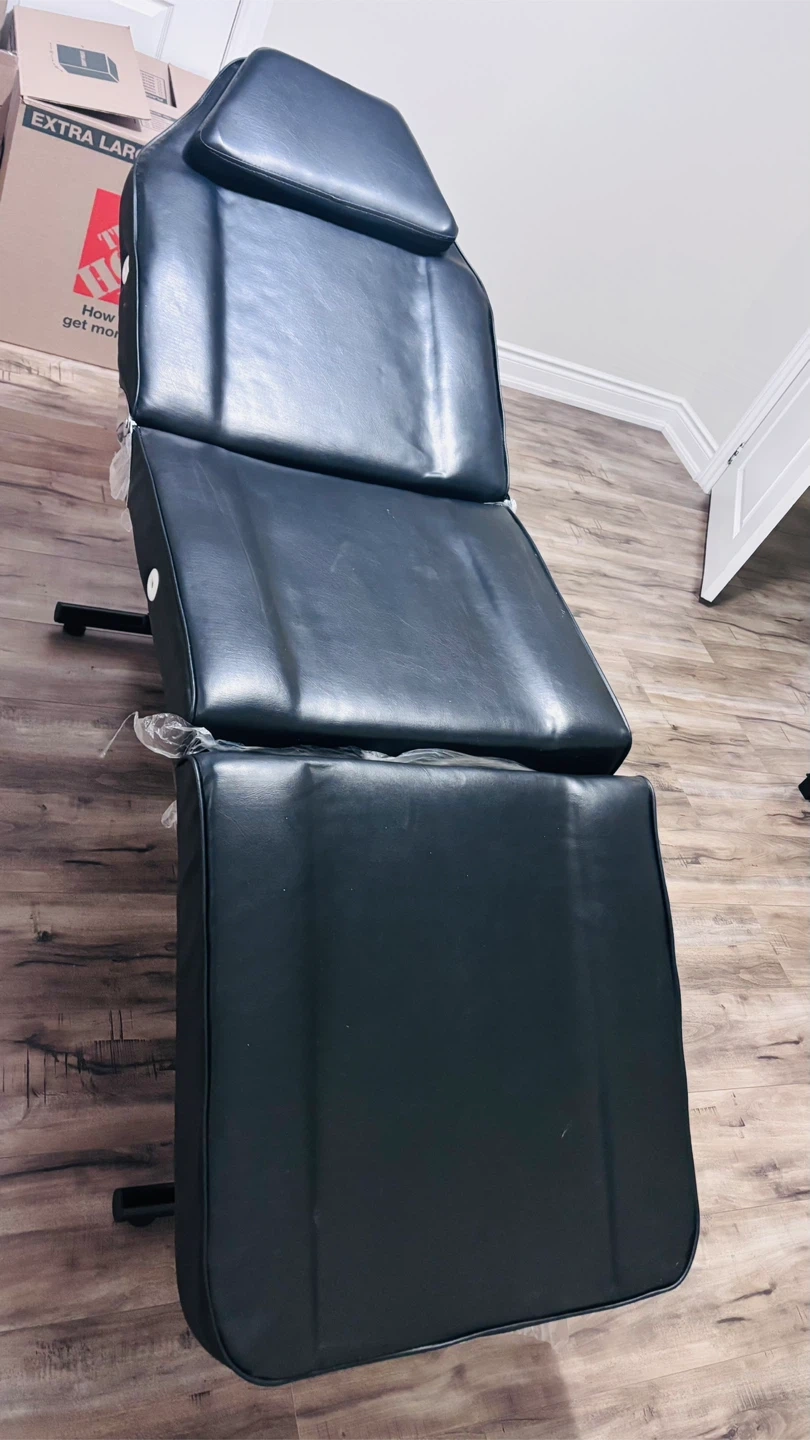 Adjustable black faux leather massage bed with headrest. It's perfect for spa treatments or massages. The bed is designed for comfort and stability.