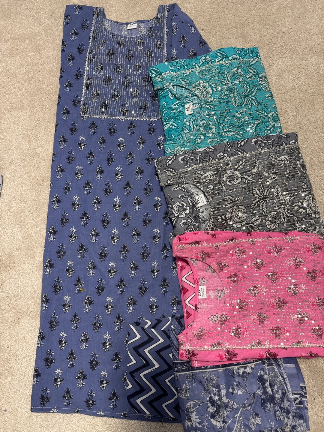 This set includes four women's tunics in various colors and prints. The blue tunic features a patterned front with sequins. The other three tunics are teal, gray, and pink, all with floral patterns and sequin embellishments. Available sizes are M, L, XXL and the blue one is not marked but seems to be a large.