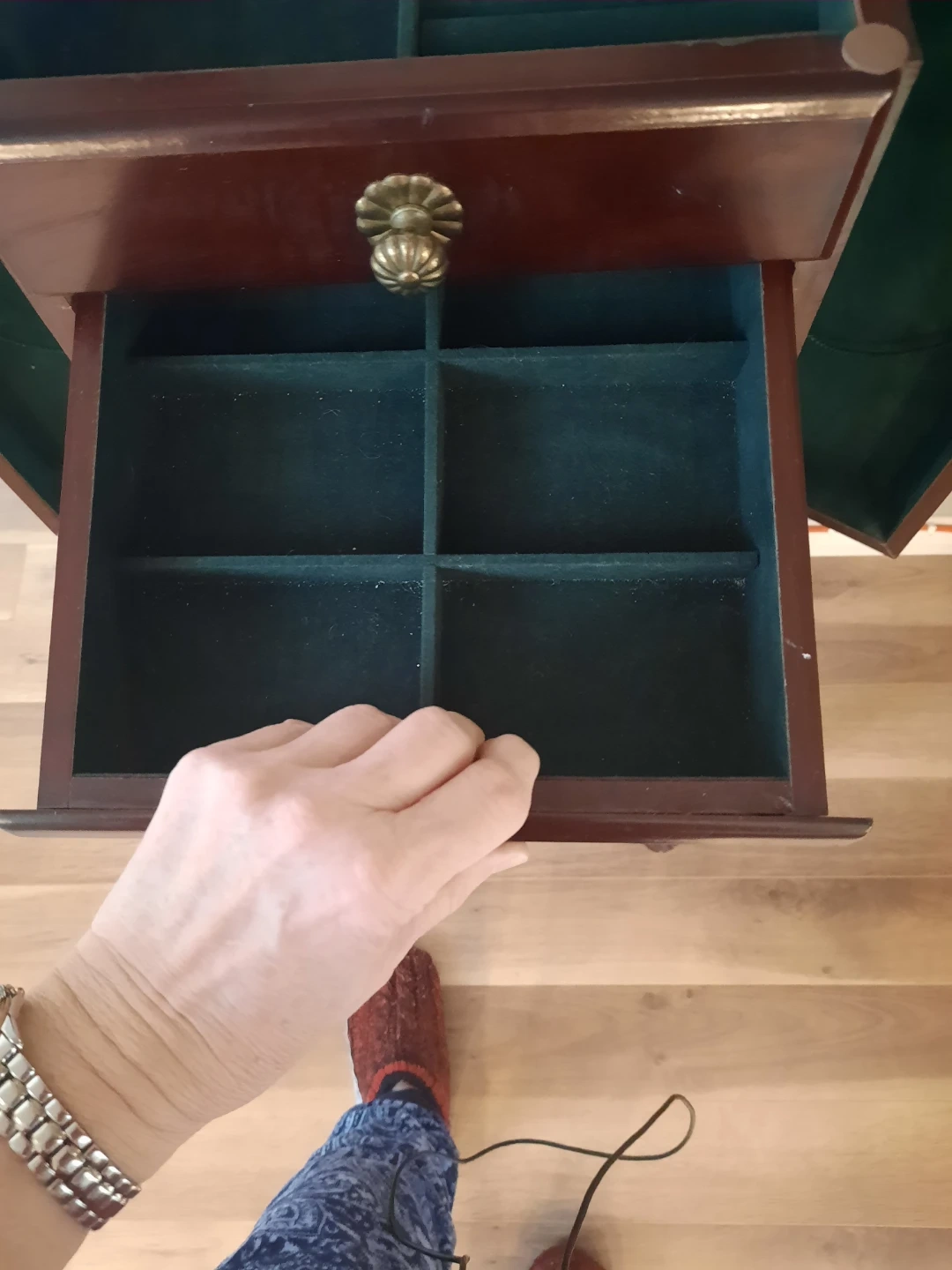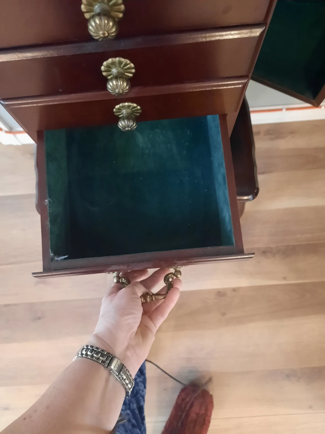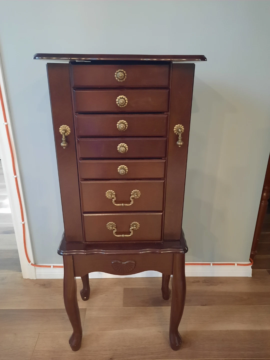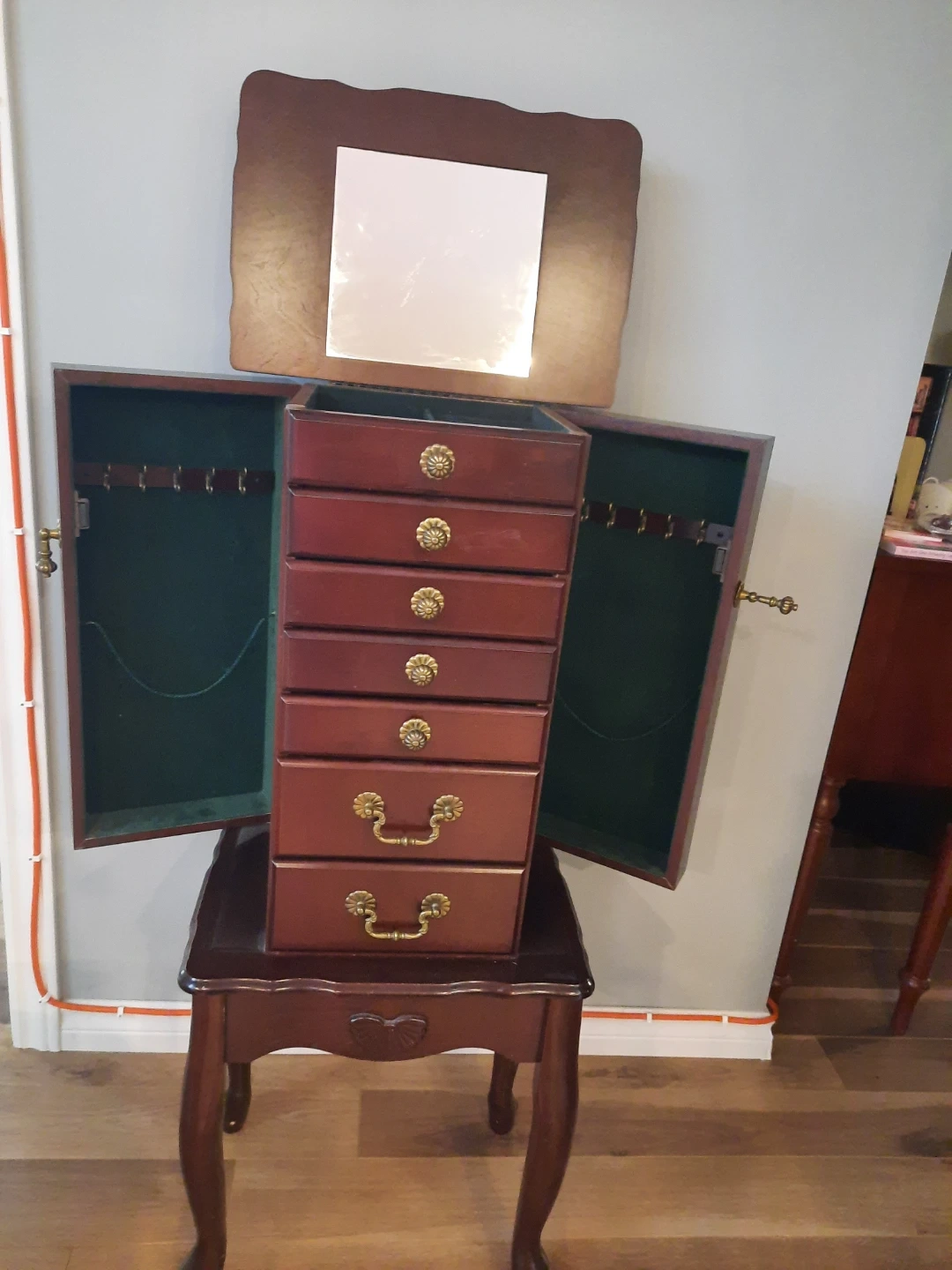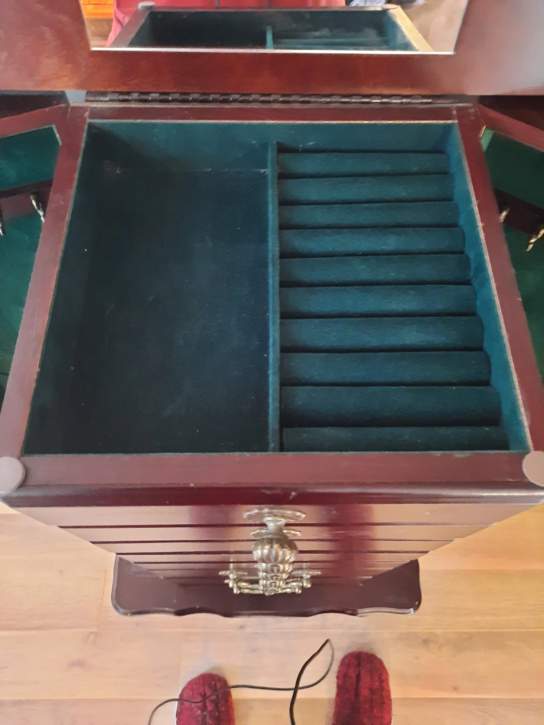 Hello, lovely Ladies and hubbies, looking for a perfect gift for your better half! This is a lovely Bombay wooden jewelry box armoire. It has a rich mahogany finish with ornate brass hardware. The interior is lined with emerald green velvet and features multiple drawers and compartments for organizing your treasures. It also includes a mirror inside the lid. I'm downsizing. So sorry to see this go! I want this lovely piece to be loved and used again. Smoke Free Home.