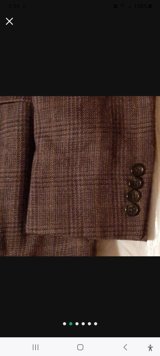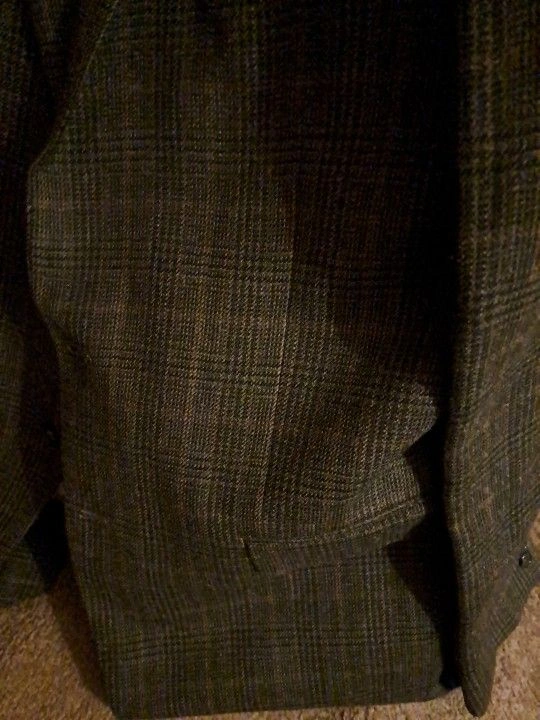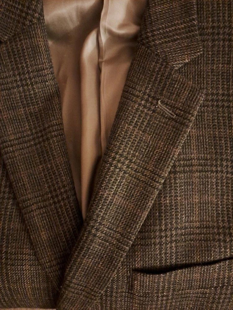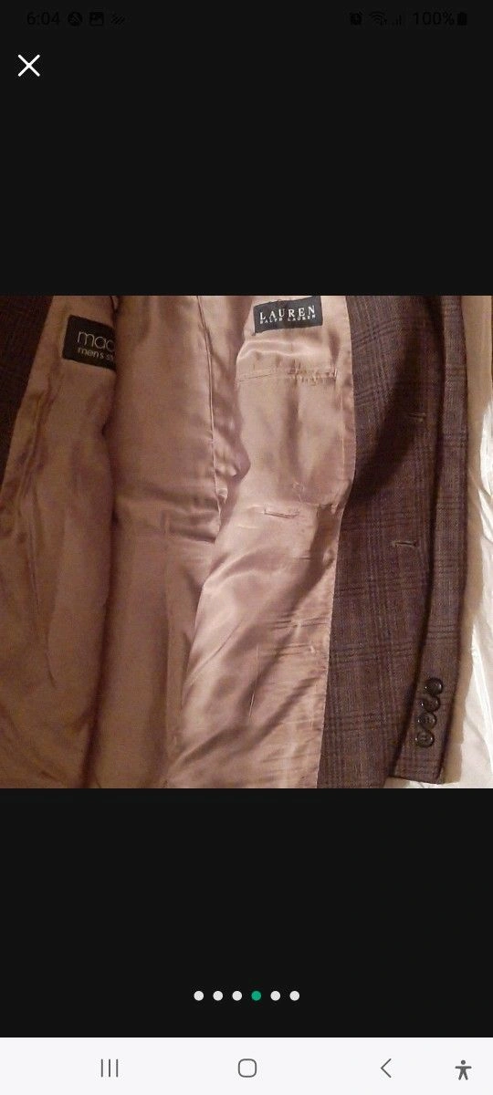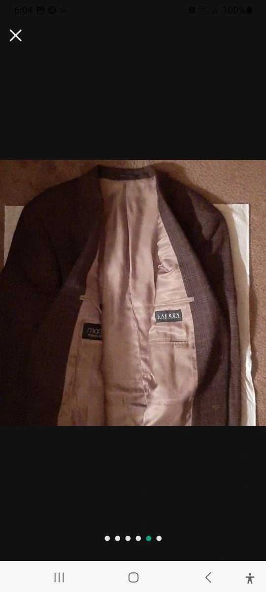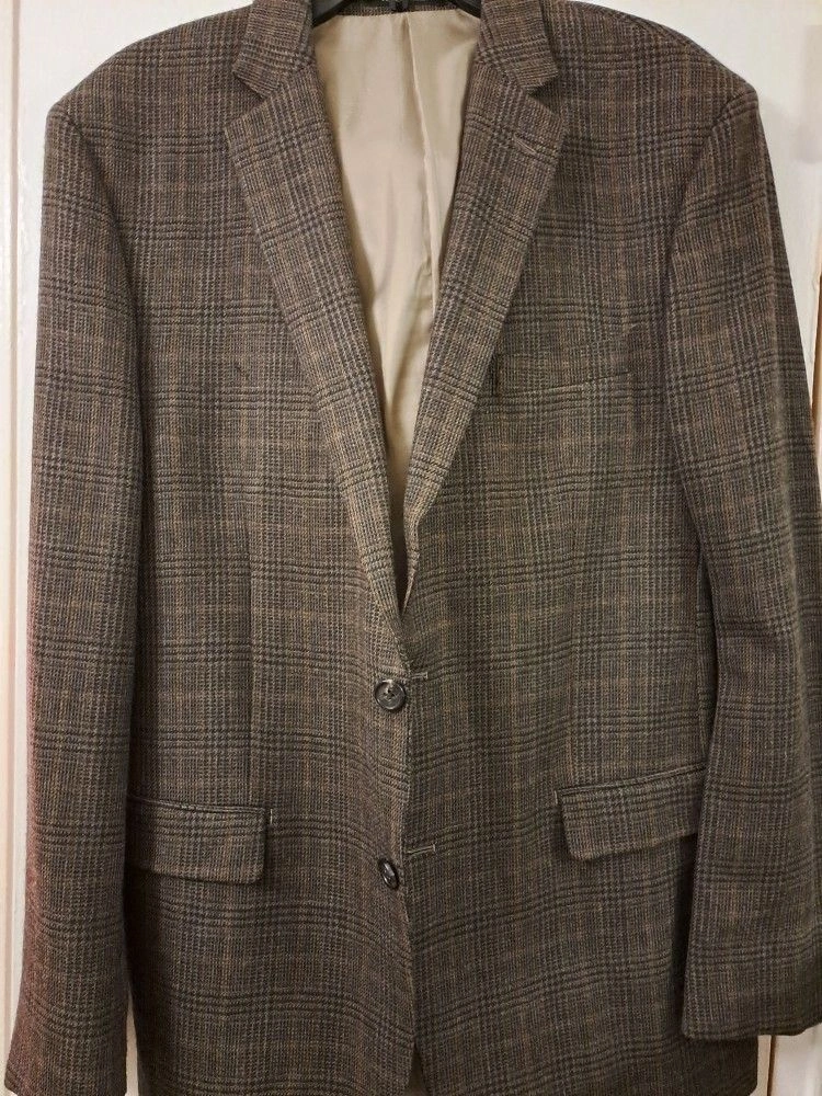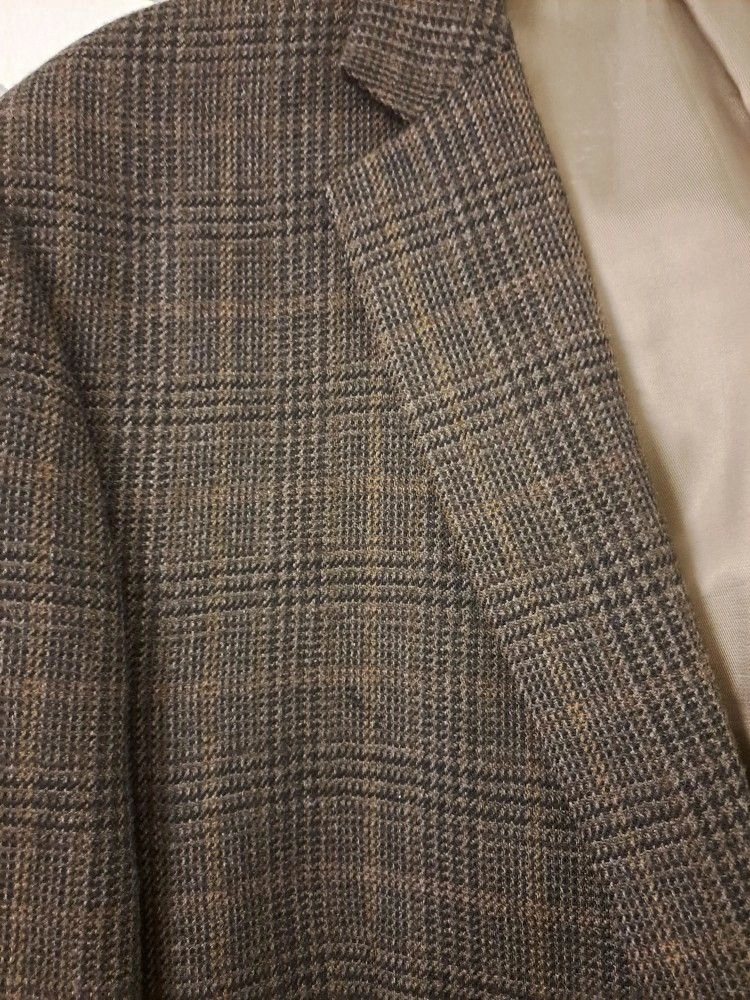 Ralph Lauren men's sportscoat suit jacket in plaid brown and tan. Features a 2-button closure and 3 inside pockets. Dry clean only. NEW w/o Tag, WITH CHEST POCKET STILL SEWN! Collar to bottom is approximately 34"L. Local pick-up; Very close Offer considered. Please, exact cash.