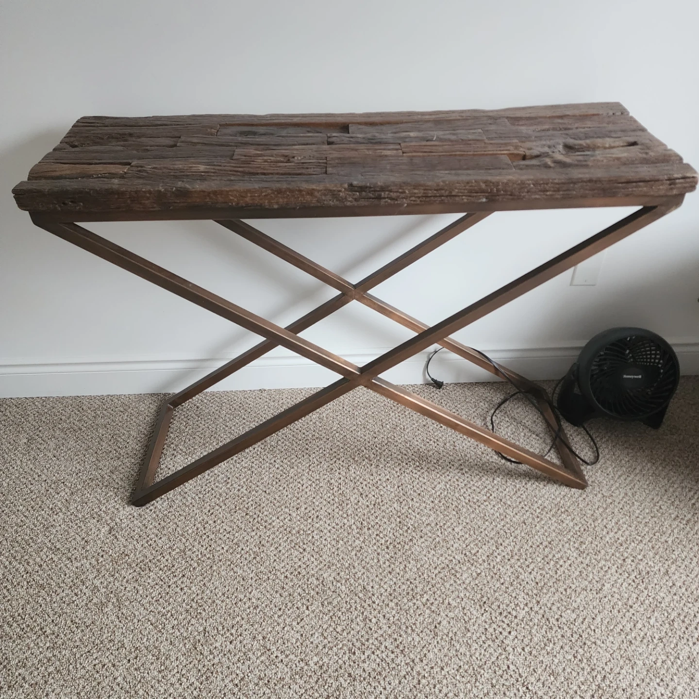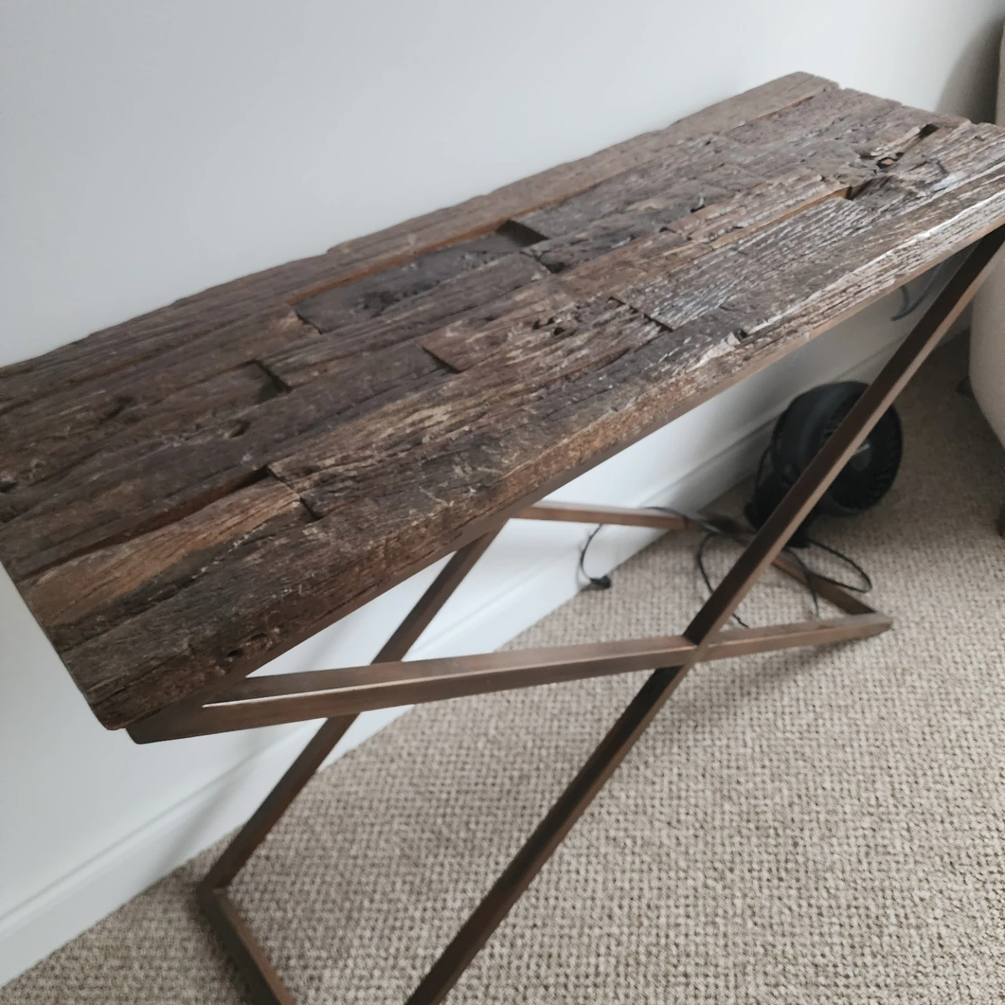 A console table featuring a rustic, reclaimed wood top with a metal X-frame base. It's a stylish piece for hallways or living areas. The wood has a textured, weathered finish.