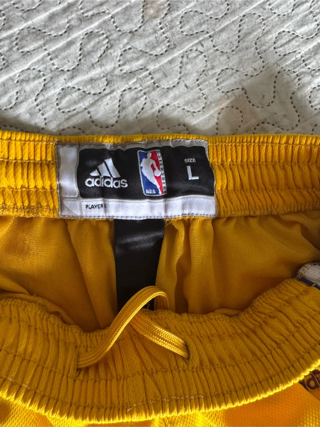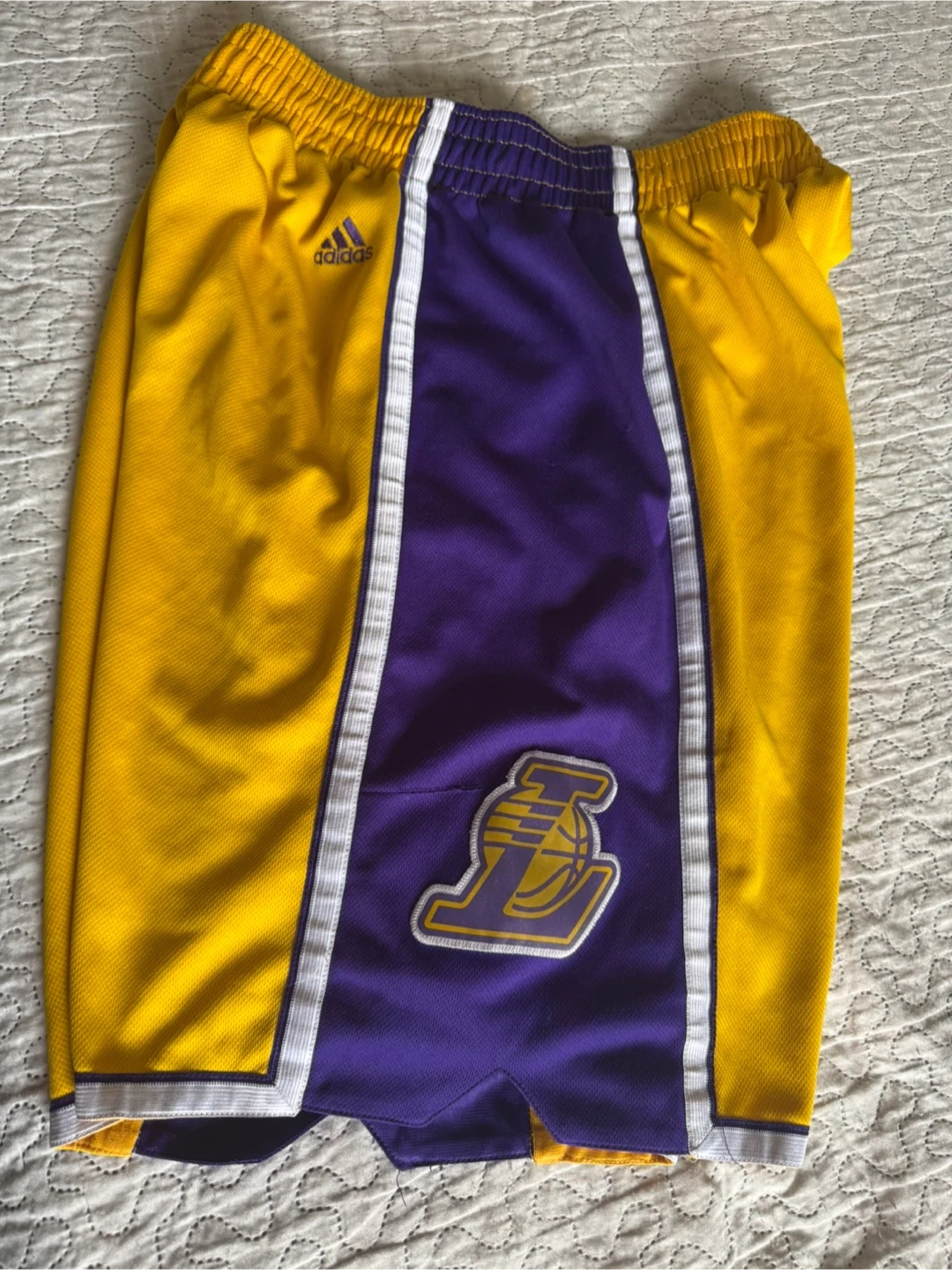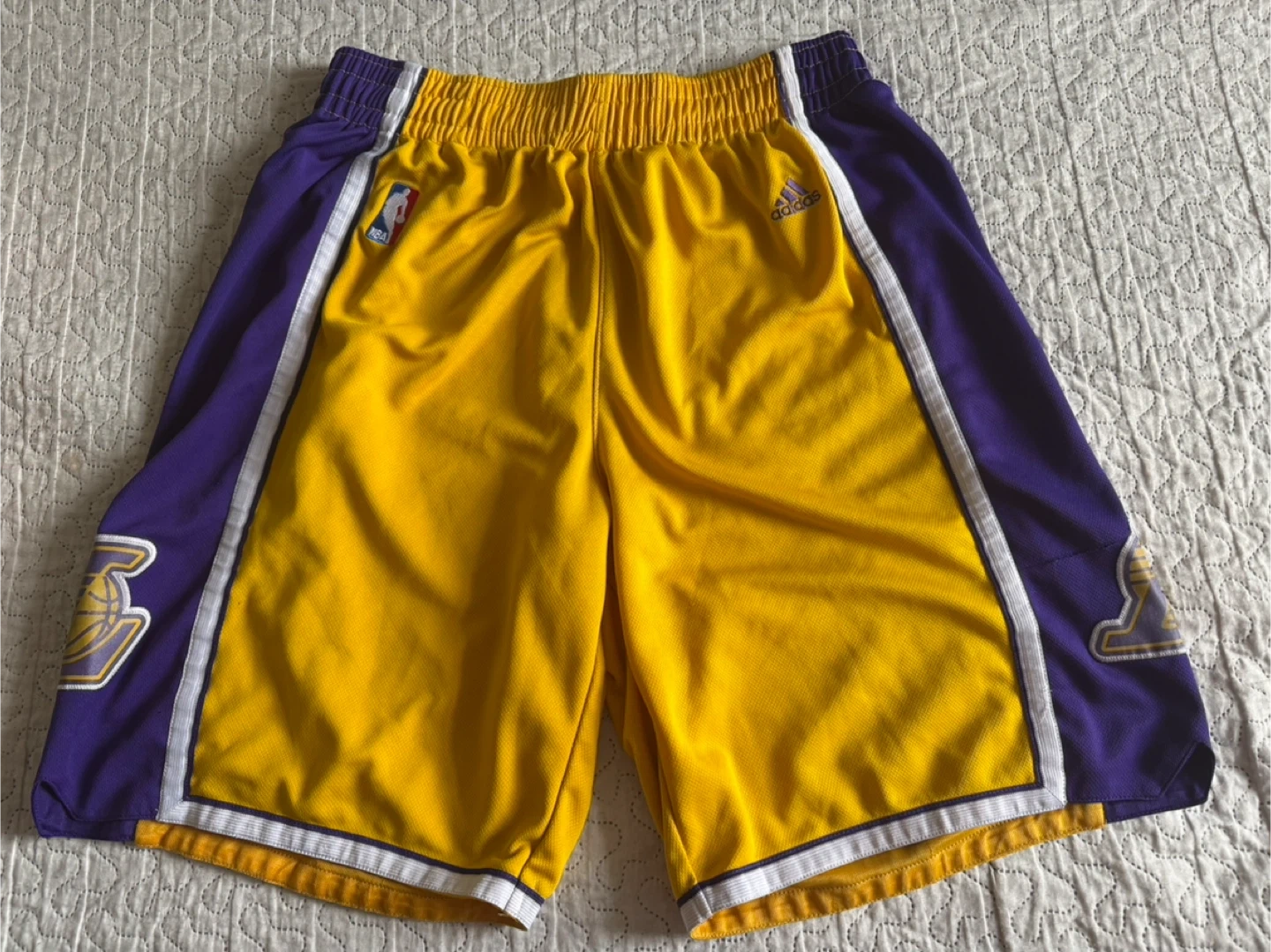 Adidas NBA basketball shorts featuring the Los Angeles Lakers colours and logo. Size is large. These shorts are perfect for hitting the court or for casual wear.