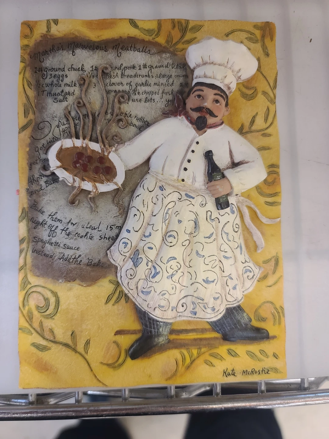This charming wall art plaque depicts a chef with "Martha's Marvelous Meatballs" recipe. The piece is signed by artist Kate McRostie.