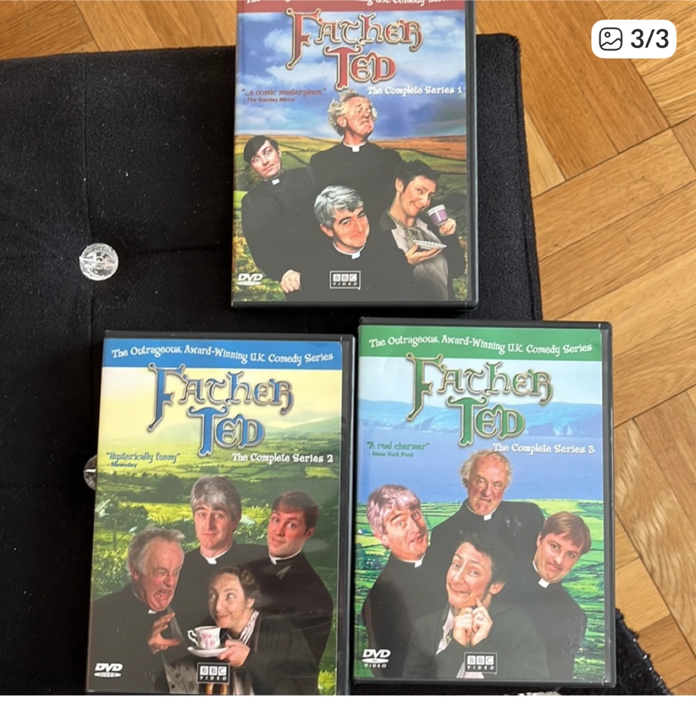 This is a complete new unopened DVD box set for the UK comedy series Father Ted, including all three seasons. It features bonus content like interviews, audio commentaries, and photo galleries.