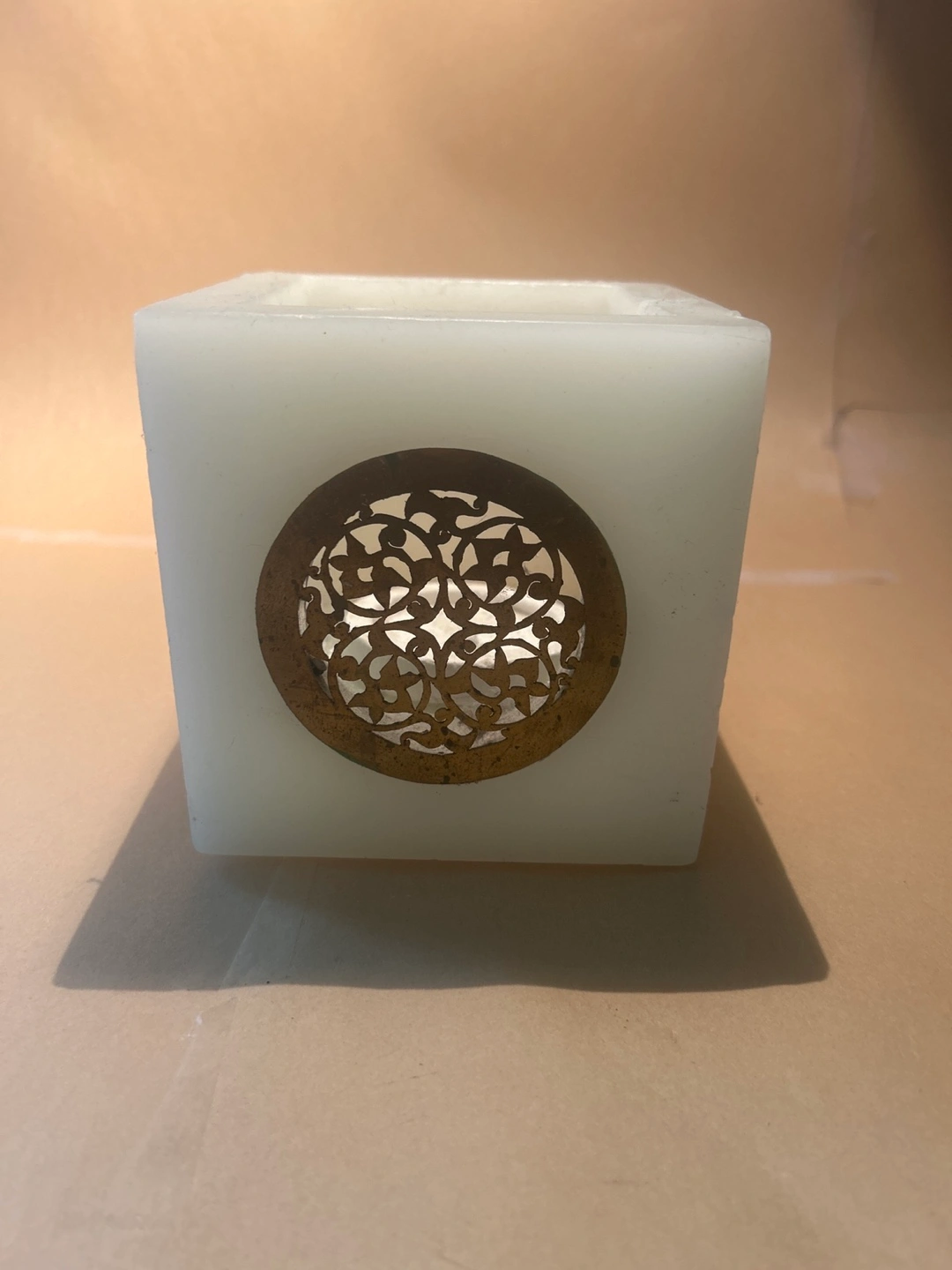 Square wax Moroccan candle holder, Features a circular brass inlay with intricate cut-out design. Perfect for home decor.