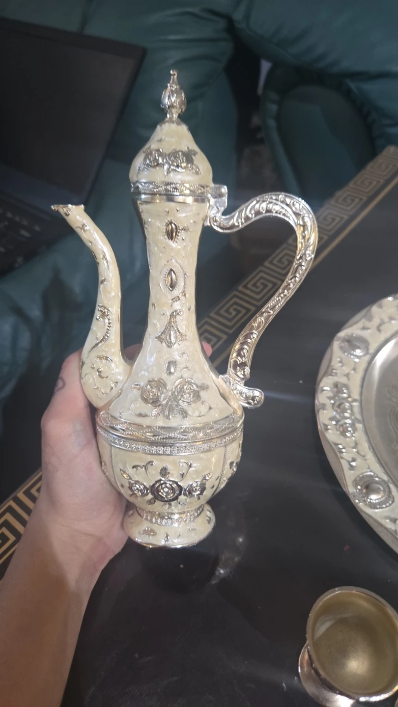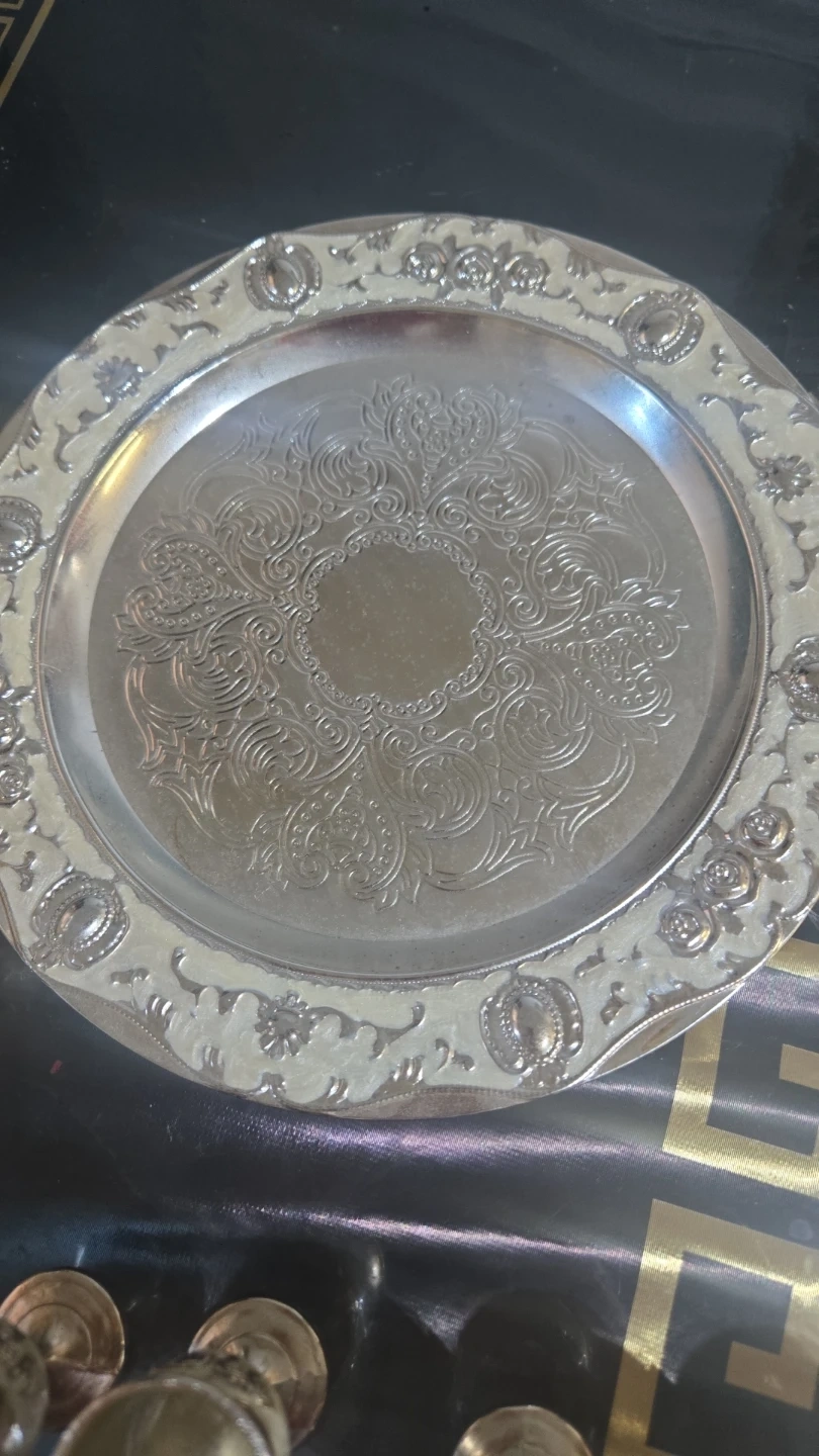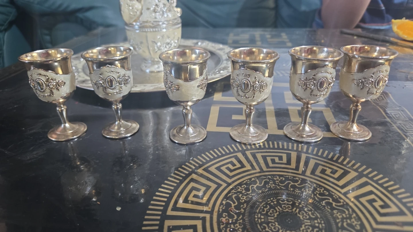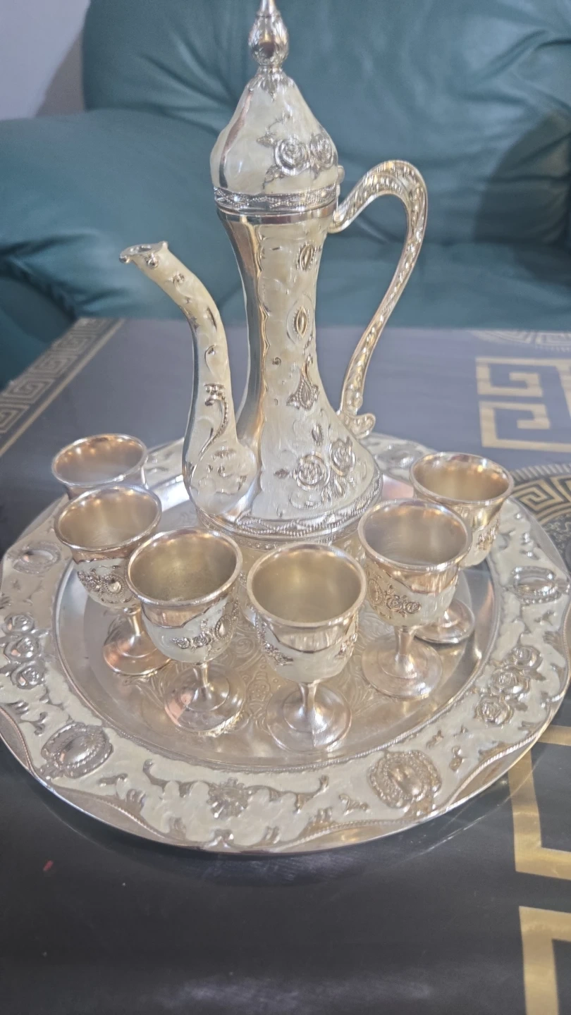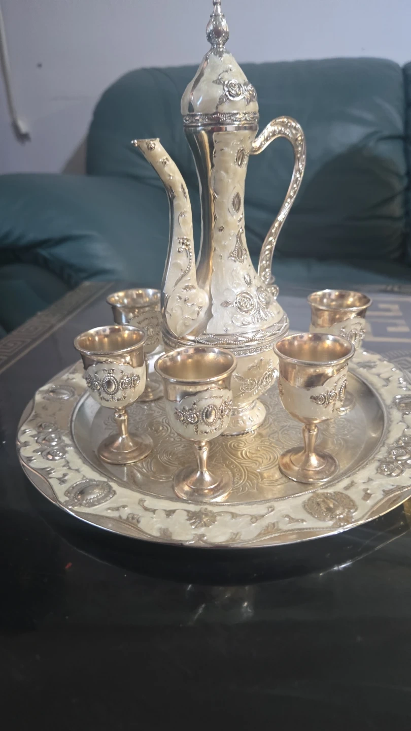 Selling a decorative silver plated drink set. It includes a pitcher, six small goblets, and a serving tray. Perfect for adding a touch of elegance to any occasion!