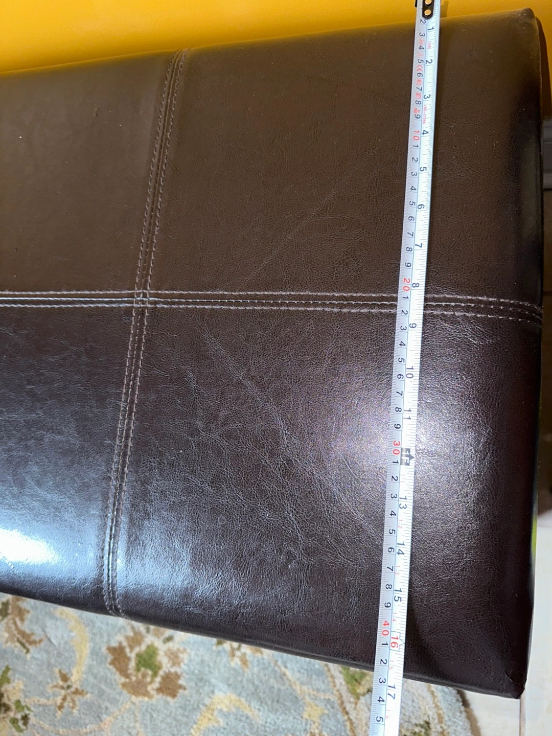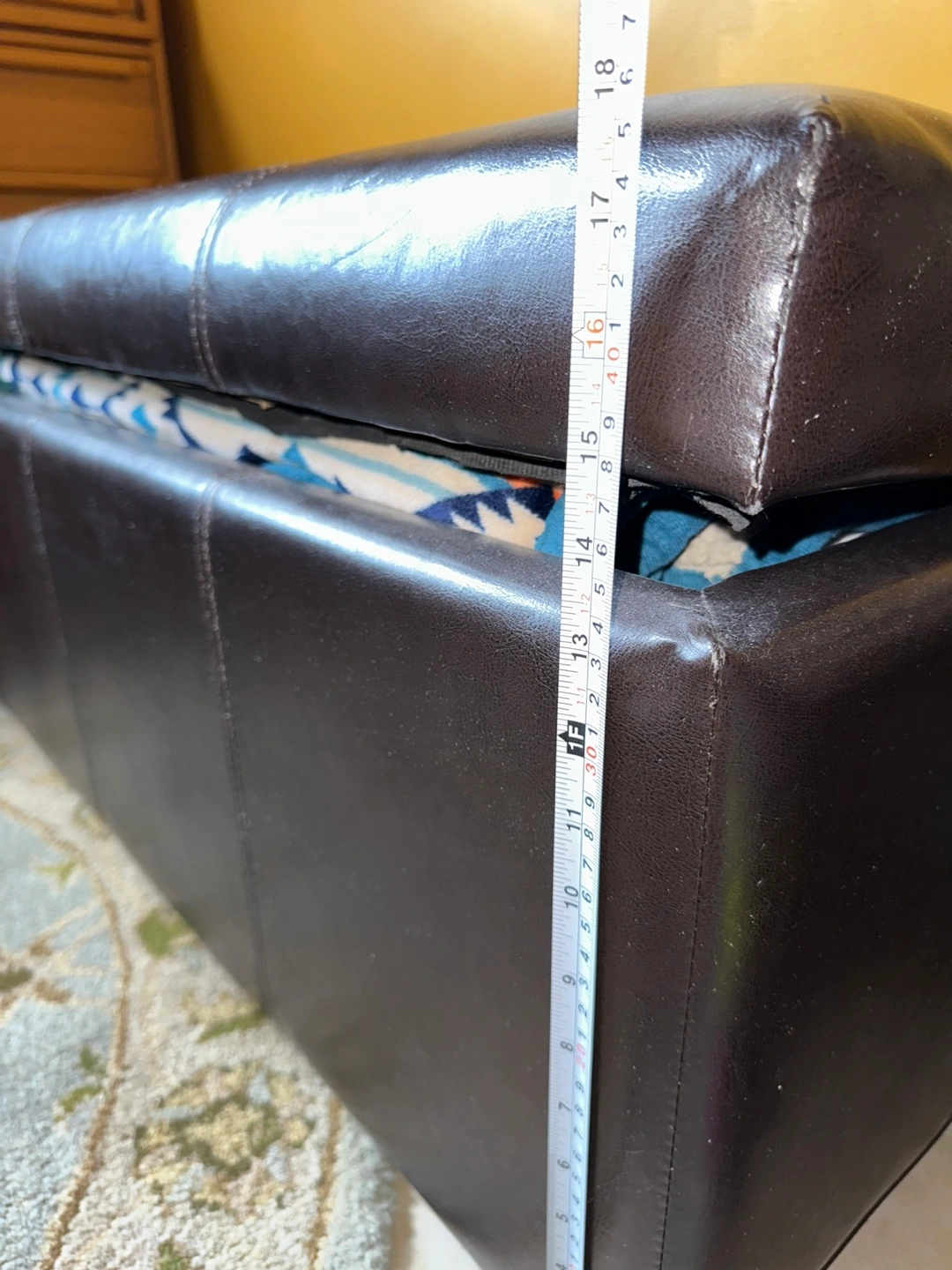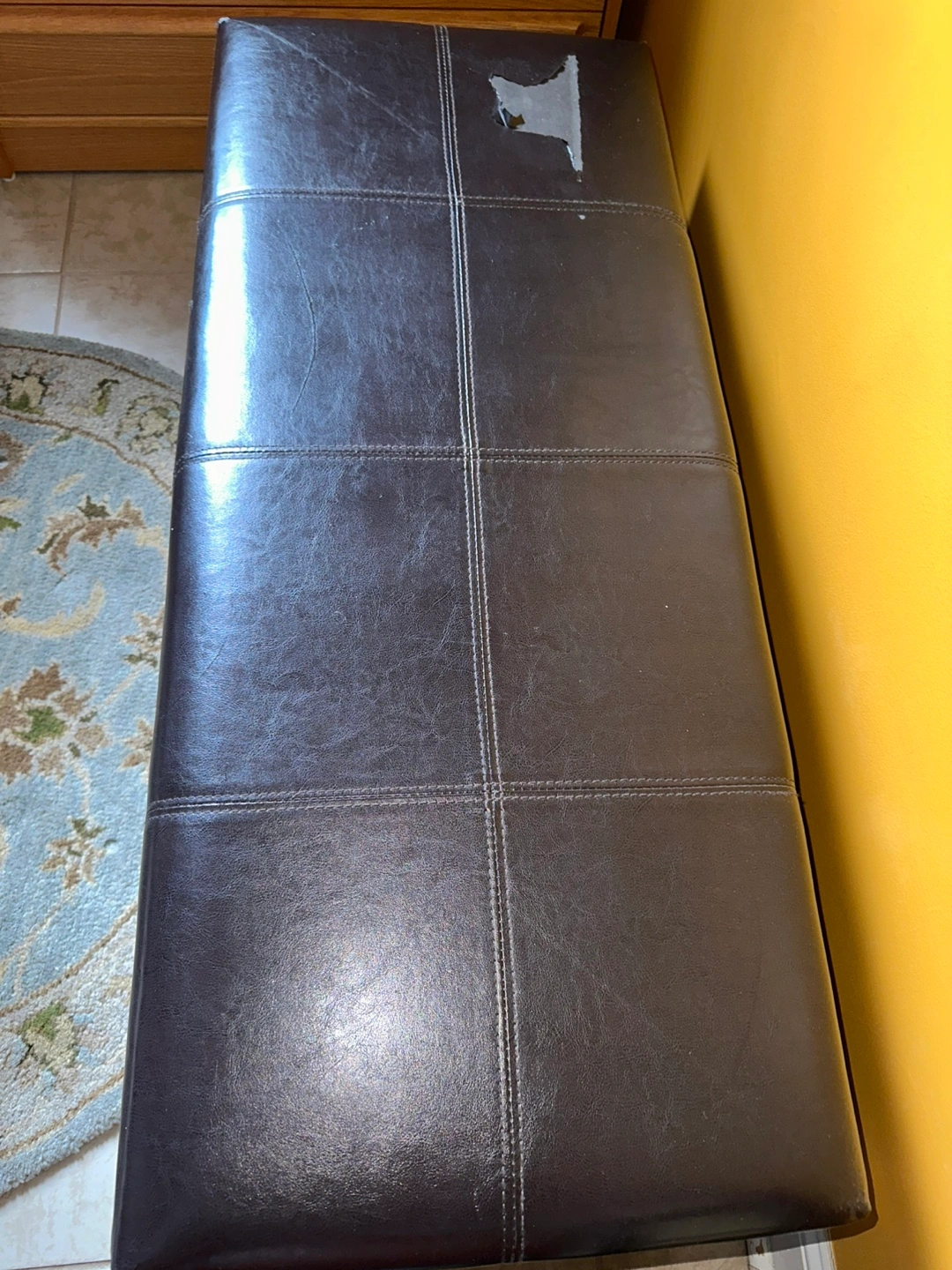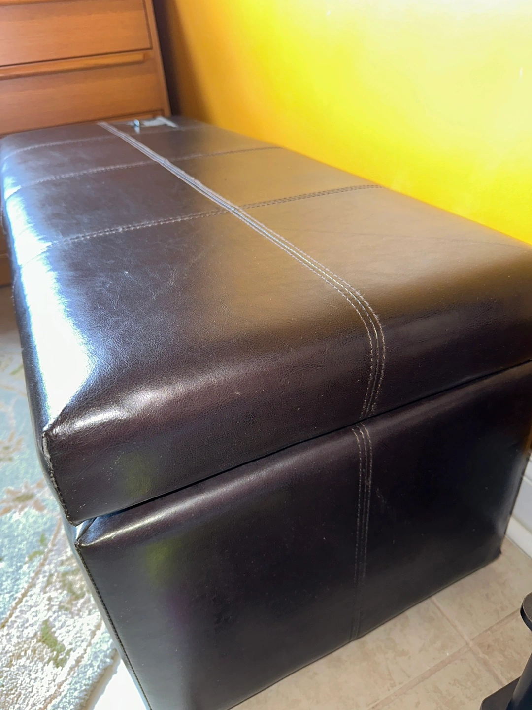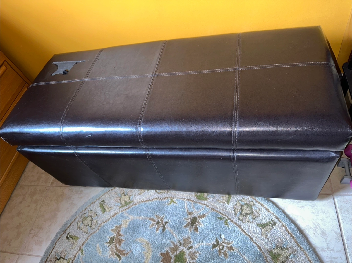 Storage bench or ottoman. 41x17x18in Lightweight. Had for 5+ years from Amazon. Faux dark brown leather. Peeling off as shown but can easily place a seat cover on it. Inside has stored blanket throws which will be removed when sold. Inside seat cover is peeling as shown but can easily staple back together. So much storage space inside, fit about 5+ blanket throws. Did the job well over the years. Still has plenty life left.