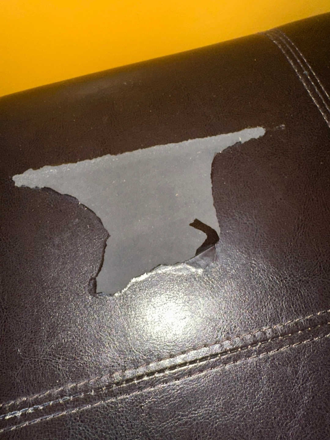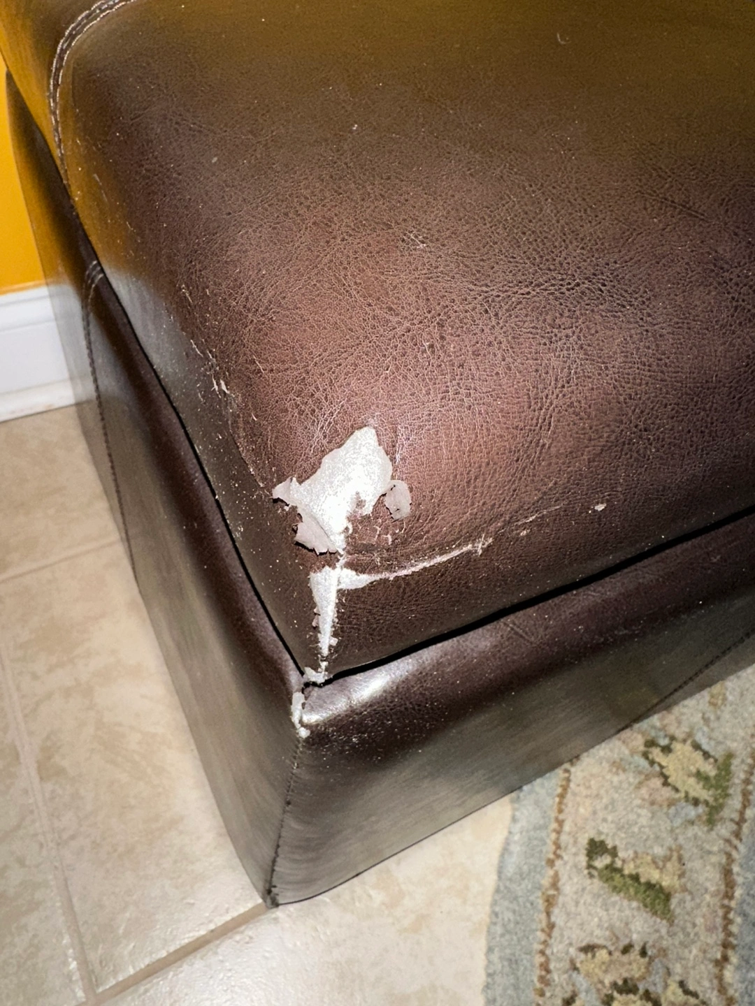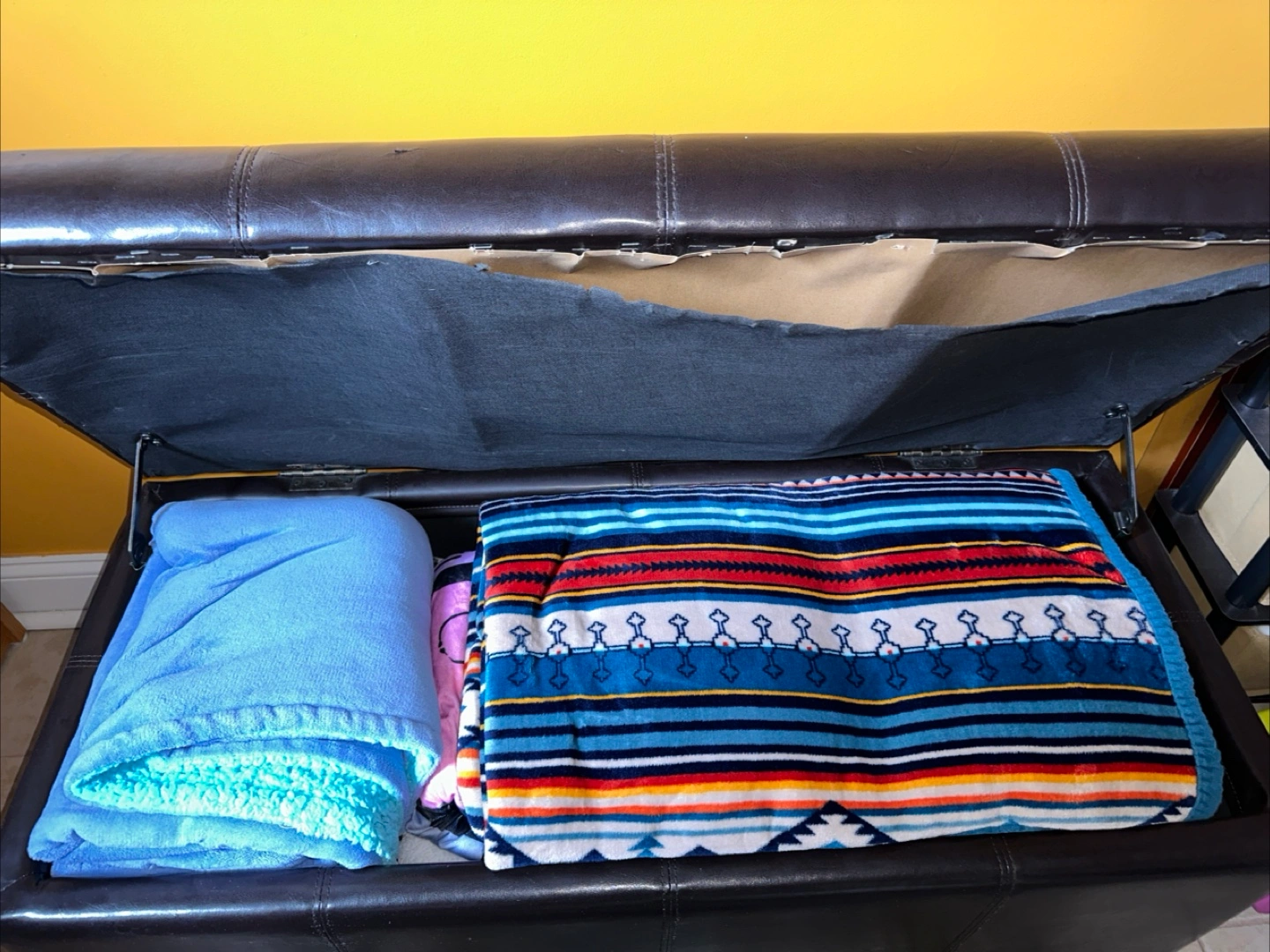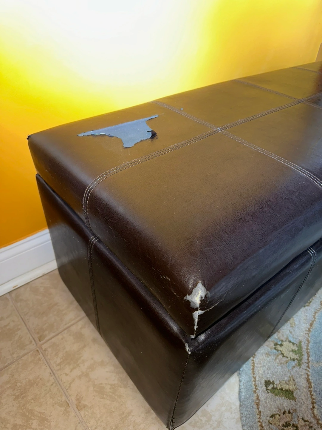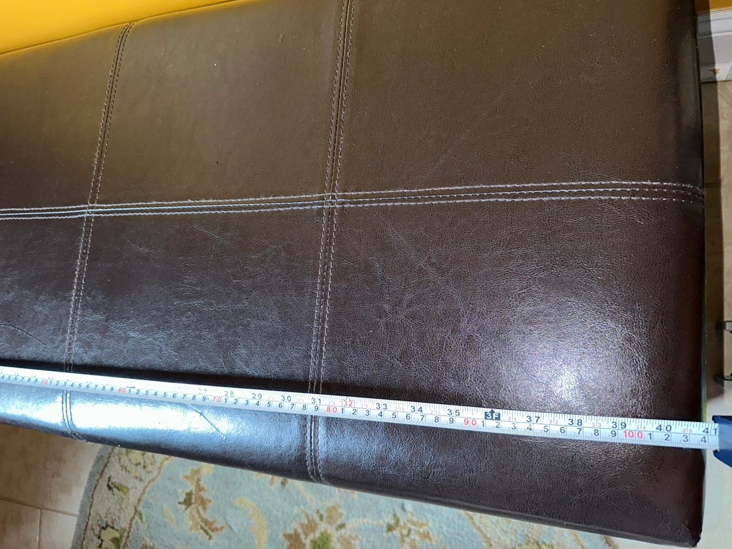 Storage bench or ottoman. 41x17x18in Lightweight. Had for 5+ years from Amazon. Faux dark brown leather. Peeling off as shown but can easily place a seat cover on it. Inside has stored blanket throws which will be removed when sold. Inside seat cover is peeling as shown but can easily staple back together. So much storage space inside, fit about 5+ blanket throws. Did the job well over the years. Still has plenty life left.