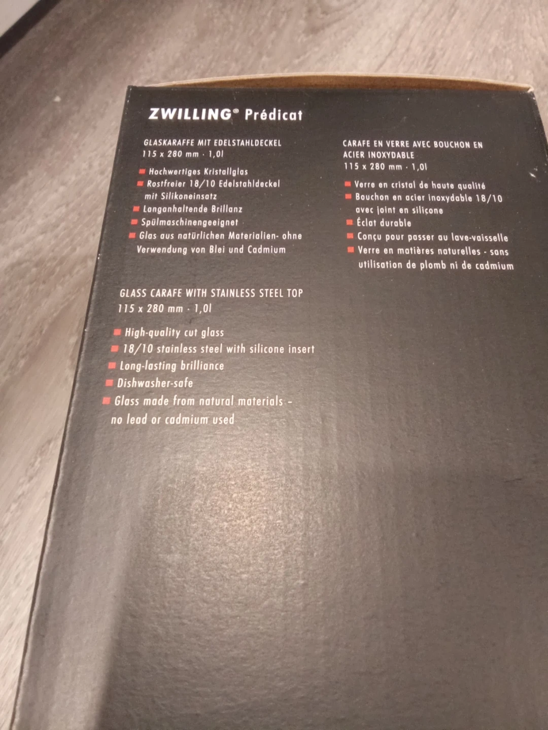 This is a ZWILLING Prédicat glass carafe with a stainless steel top. It's made from high-quality cut glass and 18/10 stainless steel with a silicone insert. The carafe is dishwasher-safe and made from natural materials, with no lead or cadmium used. It's 115 x 280 mm. 1.0L