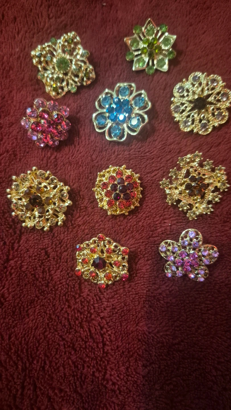 Selling a lot of nine vintage flower brooches. They're all different colours and designs, with lots of sparkly rhinestones. Perfect for adding a bit of vintage charm to your outfits or accessories! $2.00 ea