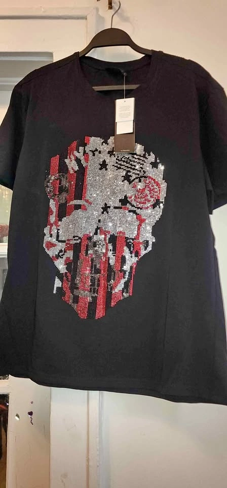 The skull design is embellished with sparkling rhinestones, including both silver and red stones to create an abstract pattern.
