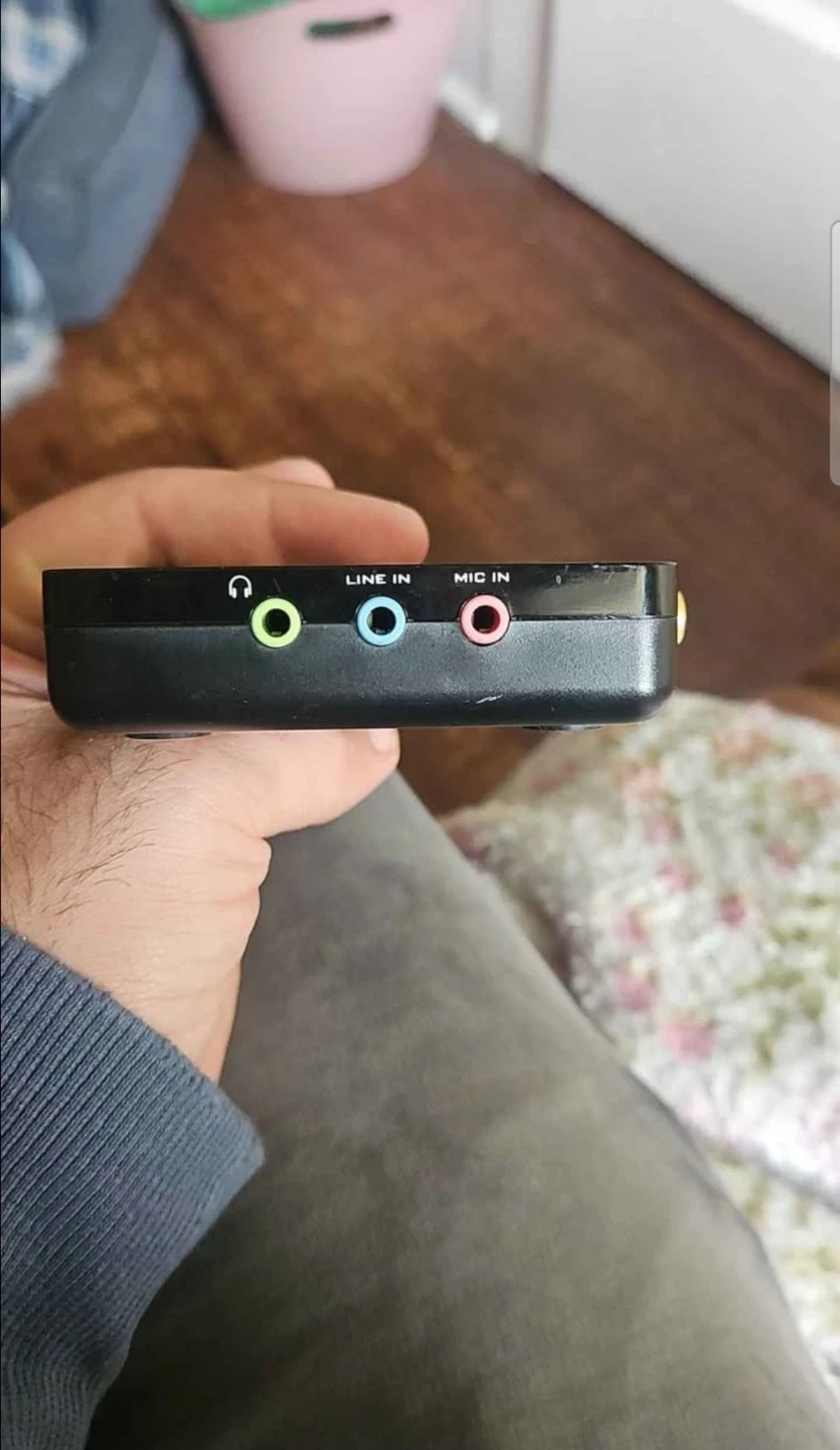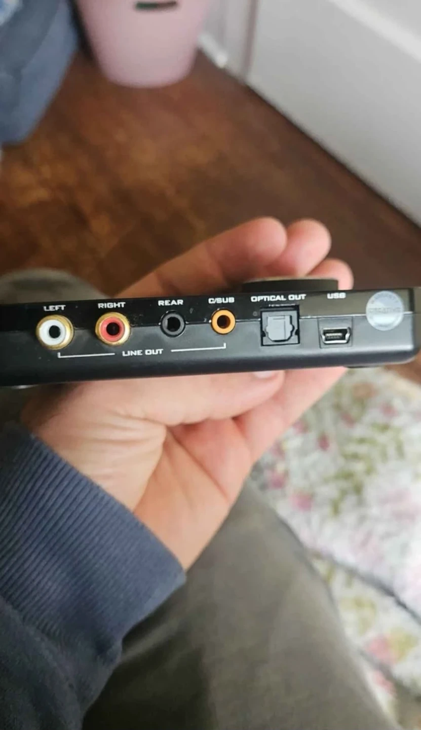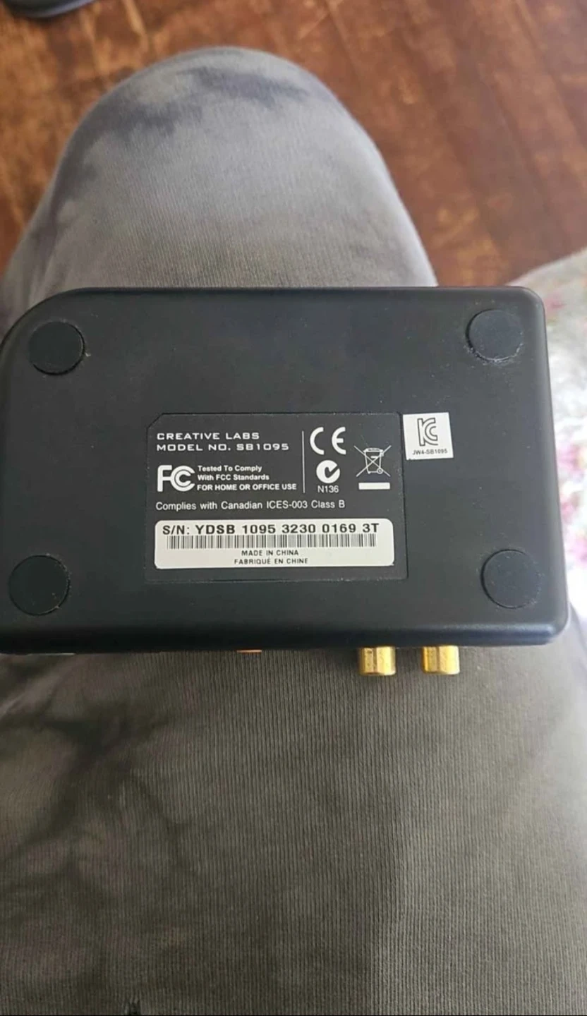 Creative Labs Sound Blaster SB SB1095 external sound card. This device has ports for headphones, line in, mic in, left, right, rear, C/SUB, optical out, and USB. It's a black, compact audio device.