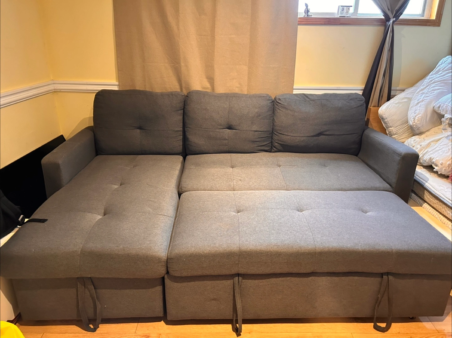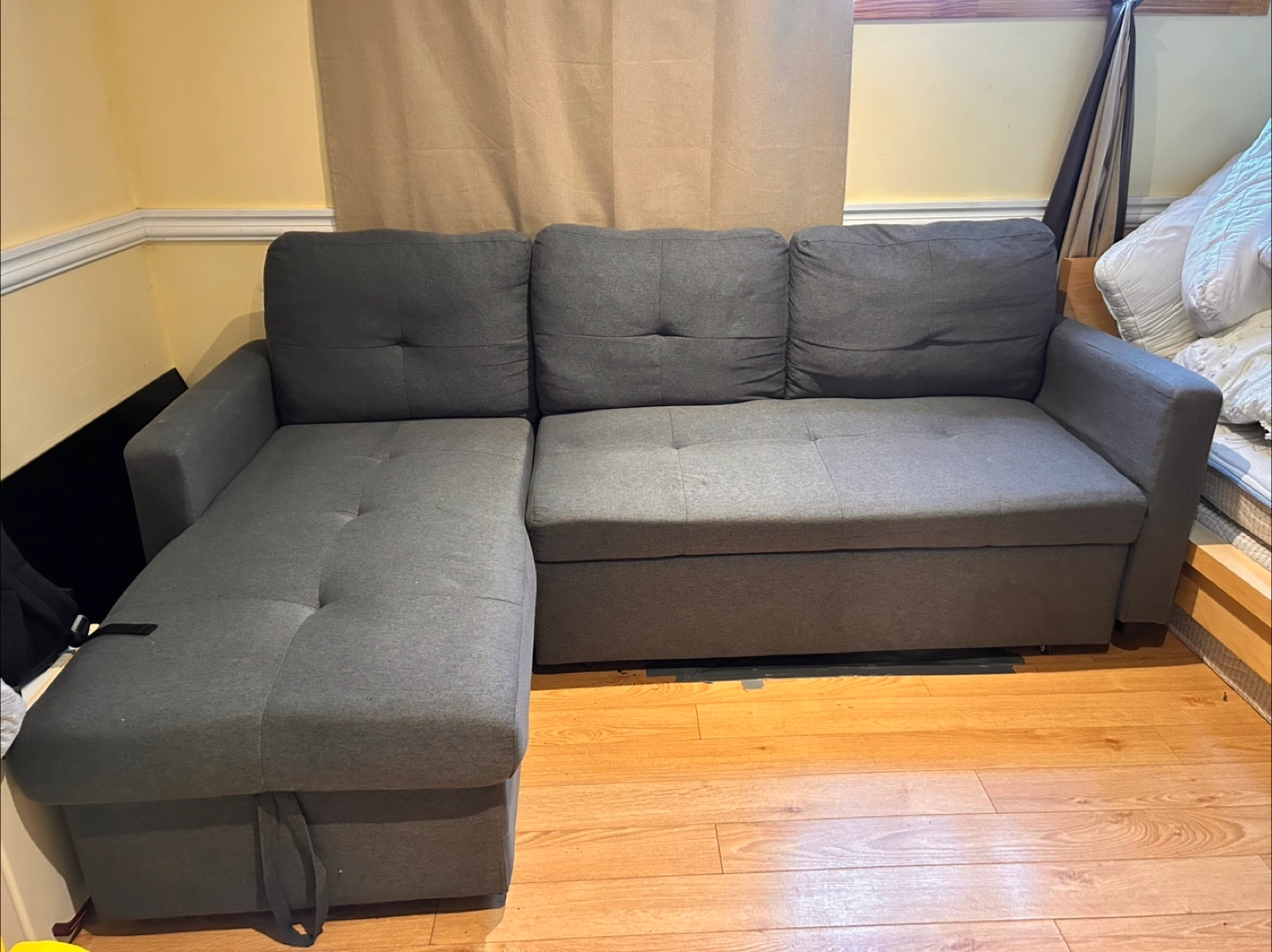Sectional sofa in a soft grey fabric. Features a chaise and a pull-out bed. The sofa has tufted seat and back cushions. Perfect for relaxing after a long day. We bought this last year November and today we’re selling it coz we’re moving out.